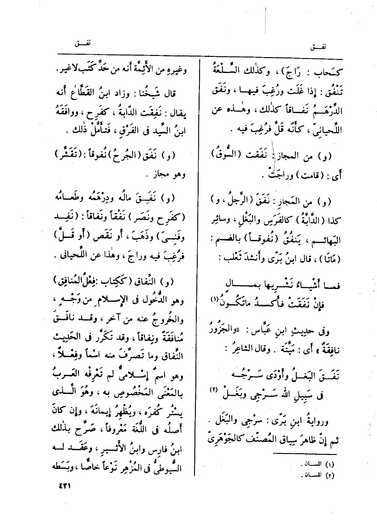 من آخر، وَقد نافَقَ مُنافَقَةً ونِفاقاً، وَقد تكرّر فِي الحديثِ النِّفاق وَمَا تصرّفَ مِنْهُ اسْماً وفِعْلاً، وَهُوَ اسمٌ إسلاميٌّ لم تعْرِفْهُ العربُ بالمَعْنى المَخْصوصِ بِهِ، وهوَ الَّذِي يسْتُر كُفرَه، ويُظْهِرُ إسمانَه، وَإِن كَانَ أصلُه فِي اللّغة معْروفاً، صرّح بذلك ابنُ فَارس وابنُ الْأَثِير، وعقَد لَهُ السُّيوطيّ فِي المُزْهِرِ نوْعاً خَاصّا، وبسَطه