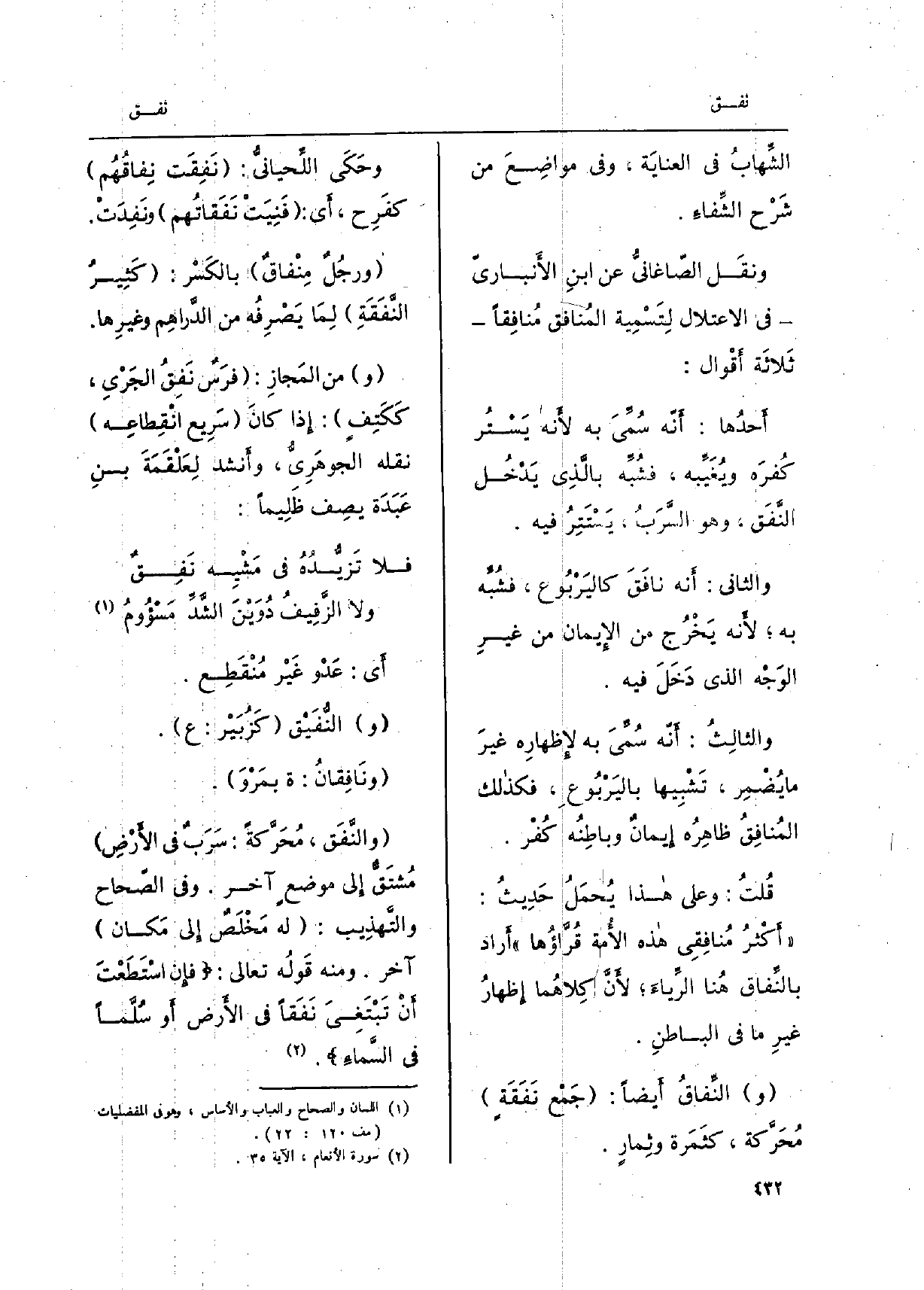 والثالِث: أنّه سُمّي بِهِ لإظهارِه غيرَ مَا يُضمِر، تشْبيهاً باليَرْبوع، فَكَذَلِك المُنافِقُ ظاهِرُه إيمانٌ وباطنُه كُفْر. قلت: وعَلى هَذَا يُحمَلُ حديثُ: أكْثرُ مُنافِقي هَذِه الأمّة قُرّاؤها، أَرَادَ بالنِّفاق هُنا الرِّياءَ لأنّ كِلاهُما إظهارُ غيرِ مَا فِي الباطِن. والنِّفاقُ أَيْضا: جمْع نفَقَةٍ مُحرَّكة، كثَمَرة وثِمار.