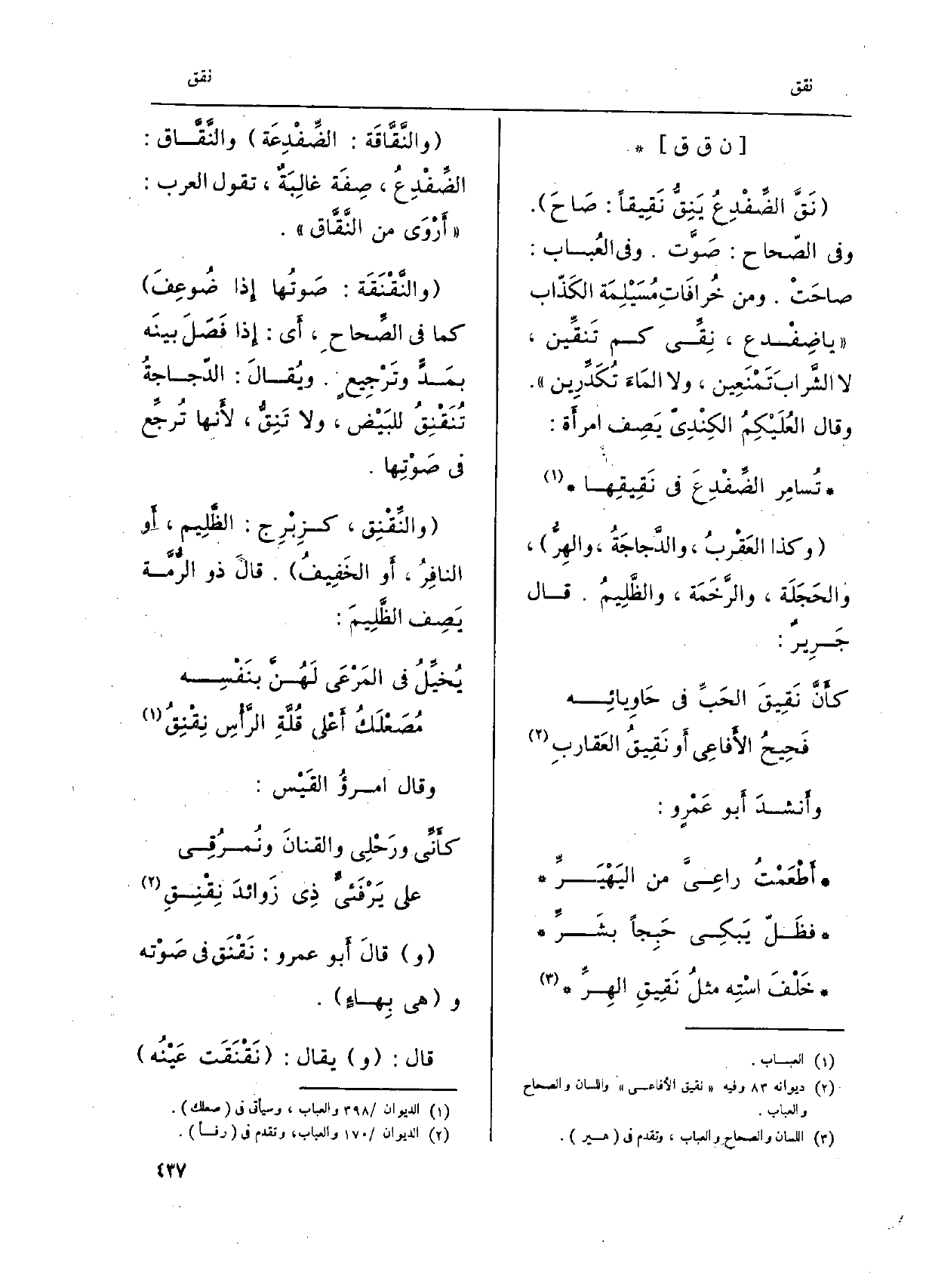 {نقَّ الضِّفْدِعُ} ينِقُّ {نَقيقاً: صاحَ. وَفِي الصِّحاح: صوّت. وَفِي العُباب: صاحَتْ. وَمن خُرافاتِ مُسَيْلِمَة الكذّاب يَا ضِفْدع،} - نِقّي كم {تنقِّين، لَا الشّرابَ تَمْنَعين، وَلَا الماءَ تُكدِّرين. وَقَالَ العُلَيْكِمُ الكِنْديّ يصِف امْرَأَة: تُسامِر الضِّفْدِعَ فِي} نَقيقِها وَكَذَا العَقْرَبُ، والدّجاجةُ، والهِرُّ، والحَجَلة، والرّخَمَة، والظّليمُ. قَالَ جرير: