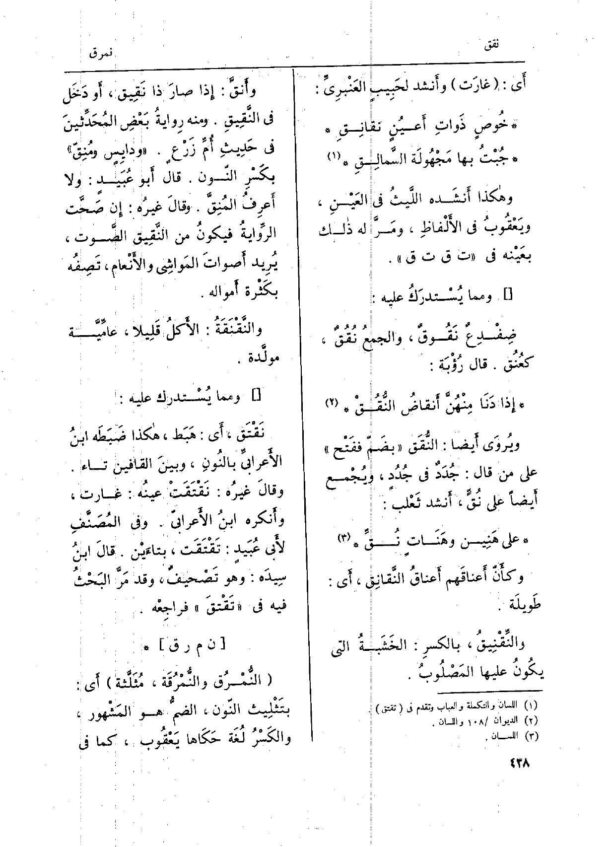 ويُروى أَيْضا: النُّقَق بضمّ ففَتْح على من قَالَ: جُدَدٌ فِي جُدُدٍ، ويُجْمع أَيْضا على {نُقٍّ، أنْشد ثعْلب: على هَنين وهَناتٍ} نُقِّ وكأنّ أعناقَهم أعناقُ النّقانِق، أَي: طَوِيلَة. {والنِّقْنيقُ، بِالْكَسْرِ: الخشَبةُ الَّتِي يكونُ عَلَيْهَا المصْلوبُ. وأنقّ: إِذا صارَ ذَا} نَقيق، أَو دخَل فِي النَّقيقِ. وَمِنْه رِوايةُ بعْضِ المُحدِّثين فِي حَدِيث أمِّ زرْعٍ. ودايِسٍ {ومُنِقّ بكسْر النّون. قَالَ أَبُو عُبيد: وَلَا أعرِفُ المُنِقَّ. وَقَالَ غيرُه: إِن صحّت الرّوايةُ فَيكون من} النّقيق الصّوت، يُرِيد أصواتَ المَواشي والأنْعام، تصِفُه بكثْرة أَمْوَاله.