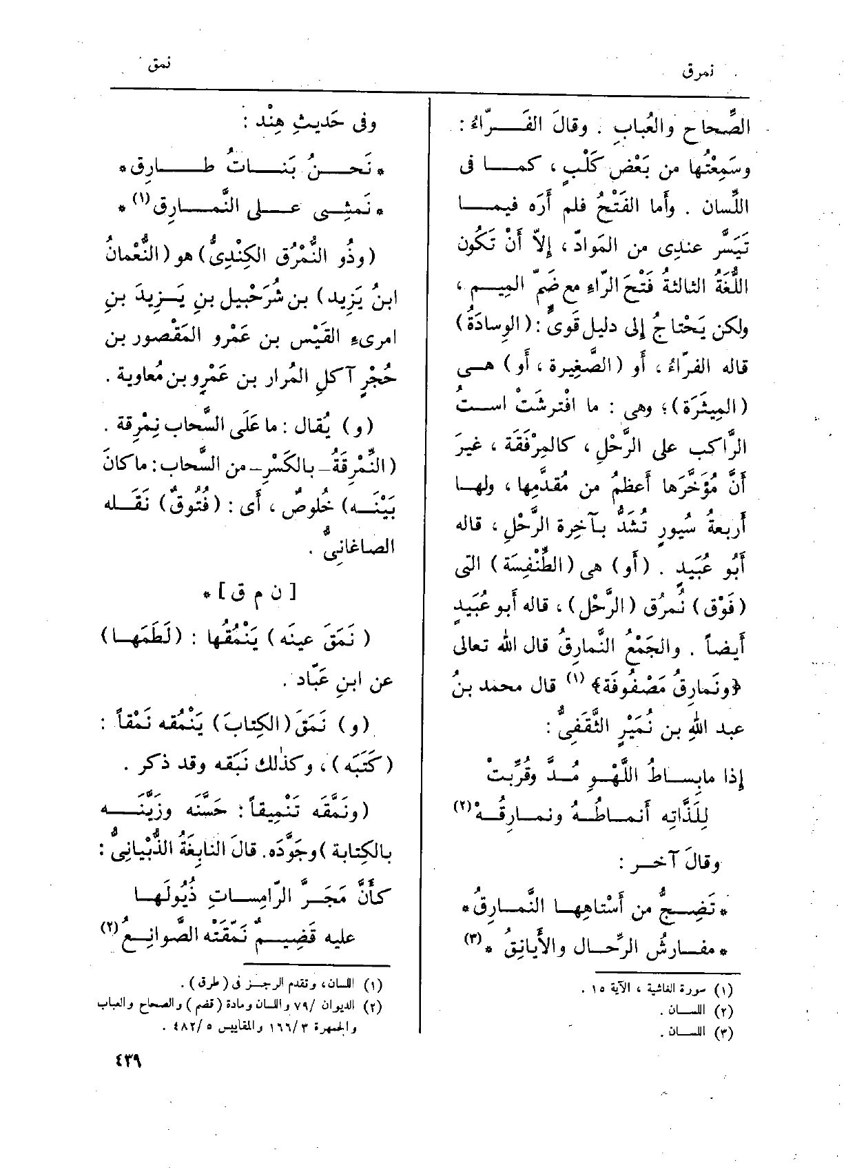 نمْشي على النّمارِق وَذُو النُّمْرُق الكِنْديّ هُوَ النُعْمانُ بنُ يَزيد بن شُرَحْبيل بن يَزيد بن امرئِ القيْس بن عمْرو المَقصور بن حُجْر آكلِ المُرار بن عَمْرو بن مُعاوية. ويُقال: مَا علَى السّحاب نِمْرِقَة. النِّمْرِقَةُ بالكسْر من السّحاب: مَا كَانَ بينَه خُلوصٌ، أَي: فُتوقٌ نقَله الصاغانيّ.