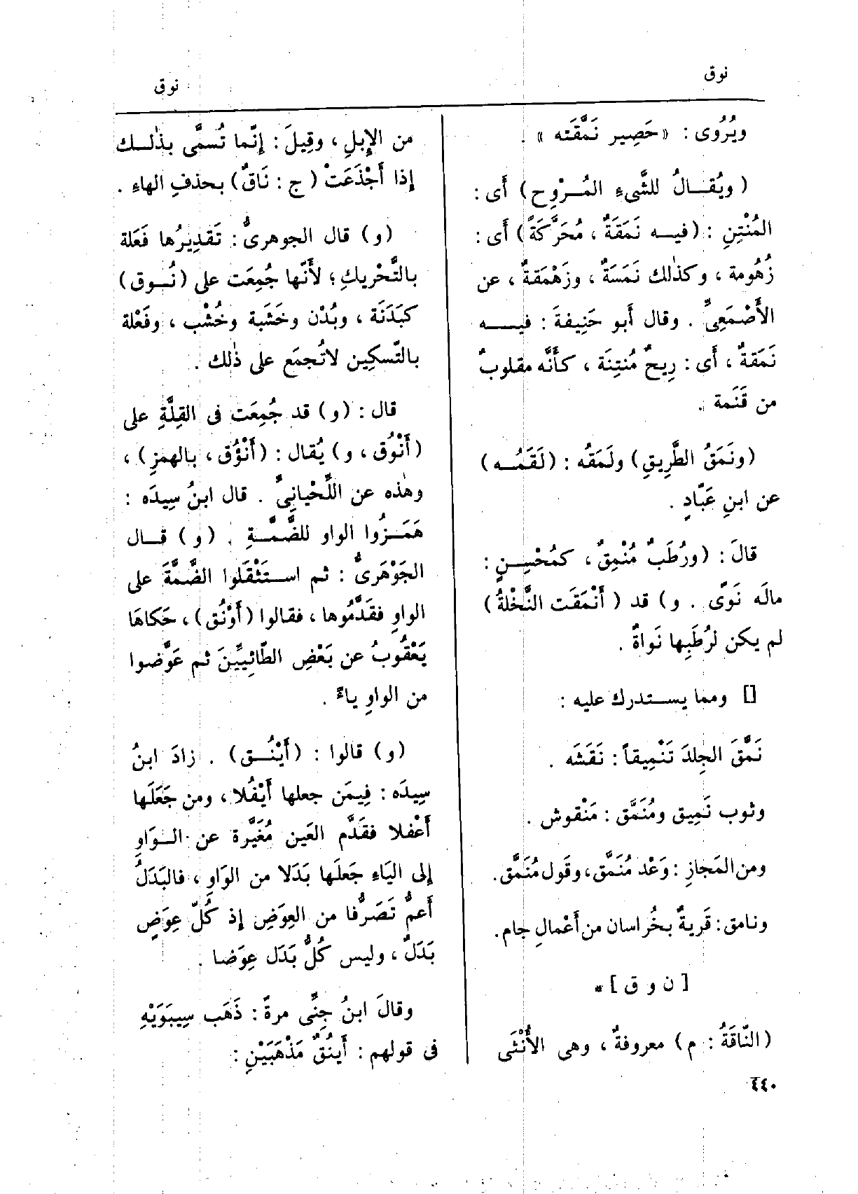 {النّاقةُ: م معروفةٌ، وَهِي الْأُنْثَى من الإبِل، وَقيل: إنّما تُسمّى بذلك إِذا أجْذَعَتْ ج:} ناقٌ بحذفِ الهاءِ. وَقَالَ الجوهريّ: تقديرُها فعَلة بالتّحْريك لأنّها جُمِعَت على {نُوق كبَدنَة، وبُدْن وخشَبة وخُشْب، وفعْلة بالتّسكين لَا تُجْمَع على ذَلِك. قَالَ: وَقد جُمِعَت فِي القِلّة على} أنْوُق، ويُقال: {أنْؤُق، بالهمزِ، وَهَذِه عَن اللِّحيانيّ. قَالَ ابنُ سيدَه: هَمَزوا الْوَاو للضّمّةِ. وَقَالَ الجوهريّ: ثمَّ استَثْقَلوا الضّمّةَ على الواوِ فقدّمُوها، فَقَالُوا أوْنُق، حَكاها يعْقوبُ عَن بعضِ الطّائِيّين ثمَّ عوّضوا من الواوِ يَاء. وَقَالُوا:} أيْنُق. زادَ ابنُ سيدَه: فيمَن جعلهَا أيْفُلاً، وَمن جعلَها أعْفلاً فقدّم الْعين مُغيَّرة عَن الْوَاو الى الياءِ جعلَها بدَلاً من الْوَاو، فالبَدَلُ أعمُّ تصَرُّفاً من العِوَض إِذْ كُلّ عِوَضٍ بدَلٌ، وَلَيْسَ كُلّ بدَل عِوَضاً. وَقَالَ ابنُ جِنّي مرّة: ذهَب سيبَويْه فِي قَوْلهم: أينُقٌ مذْهَبَيْنِ: