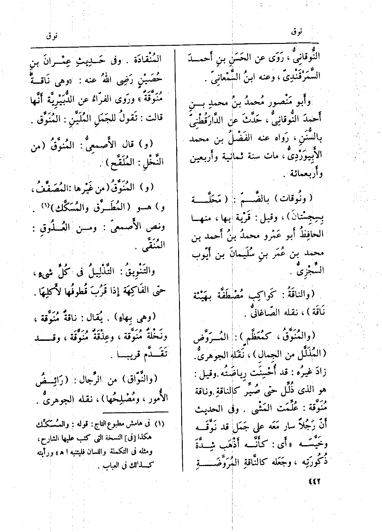 النّوقانيُّ، رَوى عَن الحسَنِ بنِ أحمدَ السّمَرْقَنْديّ، وَعنهُ ابنُ السّمْعانيّ. وَأَبُو منْصور مُحمدُ بنُ مُحَمَّد بنِ أحمدَ {- النّوقانيّ، حدّث عَن الدّارَقُطْنيّ بالسُّنَنِ، رَواه عَنهُ الفضْلُ بن مُحَمَّد الأبِيوَرْديُّ، مَاتَ سنة ثَمَانِيَة وَأَرْبَعين وَأَرْبَعمِائَة.} ونُوقات بالضمِّ: محَلّة بسِجِسْتان، وَقيل: قرْية بهَا، مِنْهَا الحافِظُ أَبُو عمْرو محمدُ بنُ أَحْمد بن مُحَمَّد بن عُمَر بنِ سُلَيْمانَ بن أيّوب السِّجْزيُّ. {والناقَةُ: كَواكِب مُصطَفّة بهَيئة ناقَة، نَقله الصاغانيّ.} والمُنَوَّقُ، كمُعَظَّمٍ: المُروَّض المُذَلَّل من الجِمال، نقَله الجوهريّ. زَاد غيرُه: قد أُحسِنَت رِياضَتُه. وَقيل: هُوَ الَّذِي ذُلِّل حَتَّى صُيِّر {كالناقةِ.} وناقة {مُنوَّقة: عُلِّمَت المشْي. وَفِي الحَدِيث أَن رجُلاً سَار معَه على جمَل قد نوّقَه وخيّسَه أَي: كأنّه أذْهَب شِدّةَ ذُكورَتِه، وجعلَه كالنّاقَةِ المُروَّضةِ المُنْقادَة. وَفِي حَدِيث عِمْرانَ بنِ حُصَيْنٍ رَضِي الله عَنهُ: وَهِي ناقةٌ} مُنوَّقةٌ ورَوى الفرّاءُ عَن الدُبَيْريّة أنّها قَالَت: تقولُ للجَمَلِ المُلَيَّنِ: المُنَوّق. وَقَالَ الأصمعيّ: {المُنوَّق من النّخْل: المُلَقَّح. والمُنوَّقُ من غيرِها: المُصَفَّفُ، وَهُوَ المُطَرَّق والمُسَكَّك. وَنَصّ الأصمعيّ: وَمن العُذوقِ: المُنَقَّى.} والتنْويقُ: التّذليلُ فِي كلِّ شيءٍ، حَتَّى الفاكِهة إِذا قَرُبَ قُطوفُها لأكلِها. وَهِي بهاءٍ. يُقال: ناقةٌ {مُنوَّقة، ونخْلةٌ} مُنوَّقة، وعِذْقَةٌ منوّقة، وَقد تقدّم قَرِيبا.! والنَّوّاق من الرِّجال: رائِضُ الْأُمُور، ومُصْلِحُها، نَقله الْجَوْهَرِي.