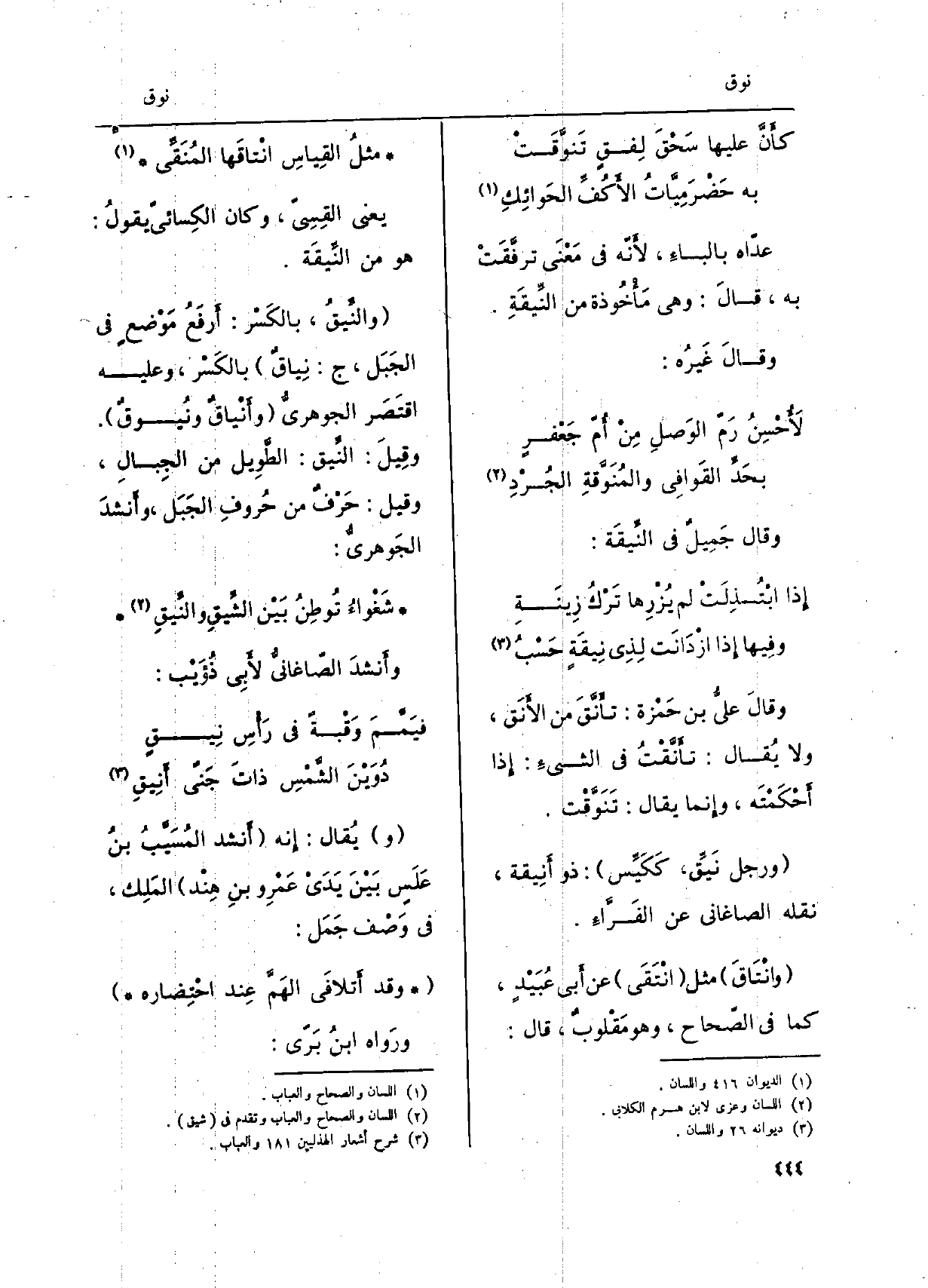 وَقَالَ عليُّ بن حمْزة: تأنّقَ من الأنَق، وَلَا يُقال: تأنّقْتُ فِي الشيءِ: إِذا أحْكَمْتَه، وَإِنَّمَا يُقَال:} تنوّقْت. وَرجل {نيِّق، ككَيِّس: ذُو أنيقة، نَقله الصَّاغَانِي عَن الفرّاءِ.} وانْتاقَ مثل انْتَقَى عَن أبي عُبَيْدٍ، كَمَا فِي الصِّحاح، وَهُوَ مقْلوبٌ، قَالَ: مثلُ القِياسِ {انْتاقَها المُنَقِّي يَعْنِي القِسيّ، وَكَانَ الكِسائيّ يَقُول: هُوَ من} النّيقَة. {والنِّيقُ، بالكسْر: أرفَعُ موْضعٍ فِي الجبَل، ج:} نِياقٌ بالكسْر، وَعَلِيهِ اقتَصَر الجوهريّ {وأنْياقٌ} ونُيوقٌ. وَقيل: {النِّيق: الطّويل من الجِبال، وَقيل: حرْفٌ من حُروفِ الجبَل، وأنشدَ الجوهريّ: شَغْواءُ توطِنُ بيْنَ الشِّيقِ} والنّيقِ وَأنْشد الصاغانيّ لأبي ذؤيْب: