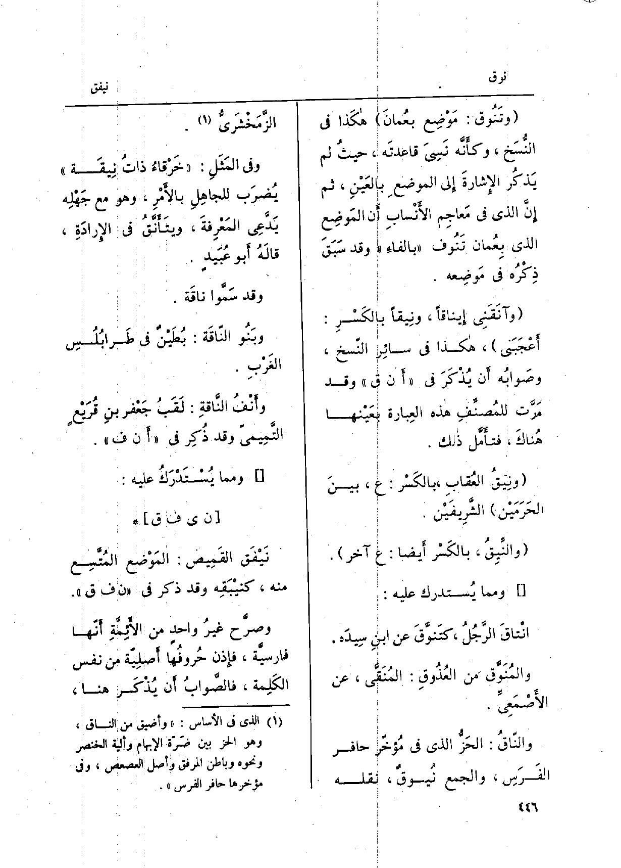 } نيْفَق القَميص: الموْضع المُتّسِع مِنْهُ، كنيْبَقِه وَقد ذكر فِي ن ف ق. وصرّح غيرُ واحدٍ من الأئمّة أنّها فارسيّة، فَإِذن حُروفُها أَصْلِيَّة من نفس الكلِمة، فالصّوابُ أَن يُذْكَر هُنَا،