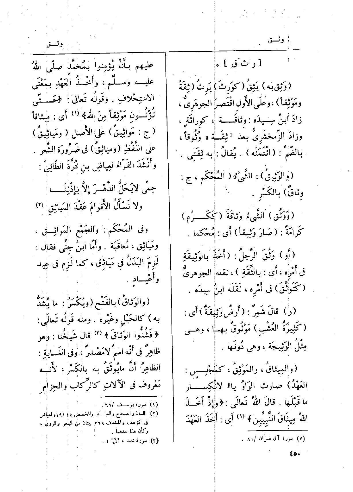} والميثاقُ، {والمَوْثِقُ، كمَجْلِس: العهْدُ صَارَت الواوُ يَاء لانْكِسار مَا قَبْلَها. قَالَ اللهُ تعالَى:) وإذْ أخذَ اللهُ} ميثاقَ النّبيّين (أَي: أخذَ العهْدَ عَلَيْهِم بأنْ يُؤمِنوا بمحمّدٍ صلّى الله عَلَيْهِ وسلّم، وأخْذُ العهْدِ بمَعْنى الاستِحْلافِ. وقولُه تَعالى:) حتّى تؤْتونِ {مَوْثِقاً منَ الله (أَي:} ميثاقاً ج: {مَواثيقُ على الأَصْل} ومَياثِيقُ على اللّفْظِ {ومياثِقُ فِي ضَرورة الشِّعر. وأنْشَدَ الفرّاءُ لعِياضِ بنِ دُرّةَ الطّائيّ: