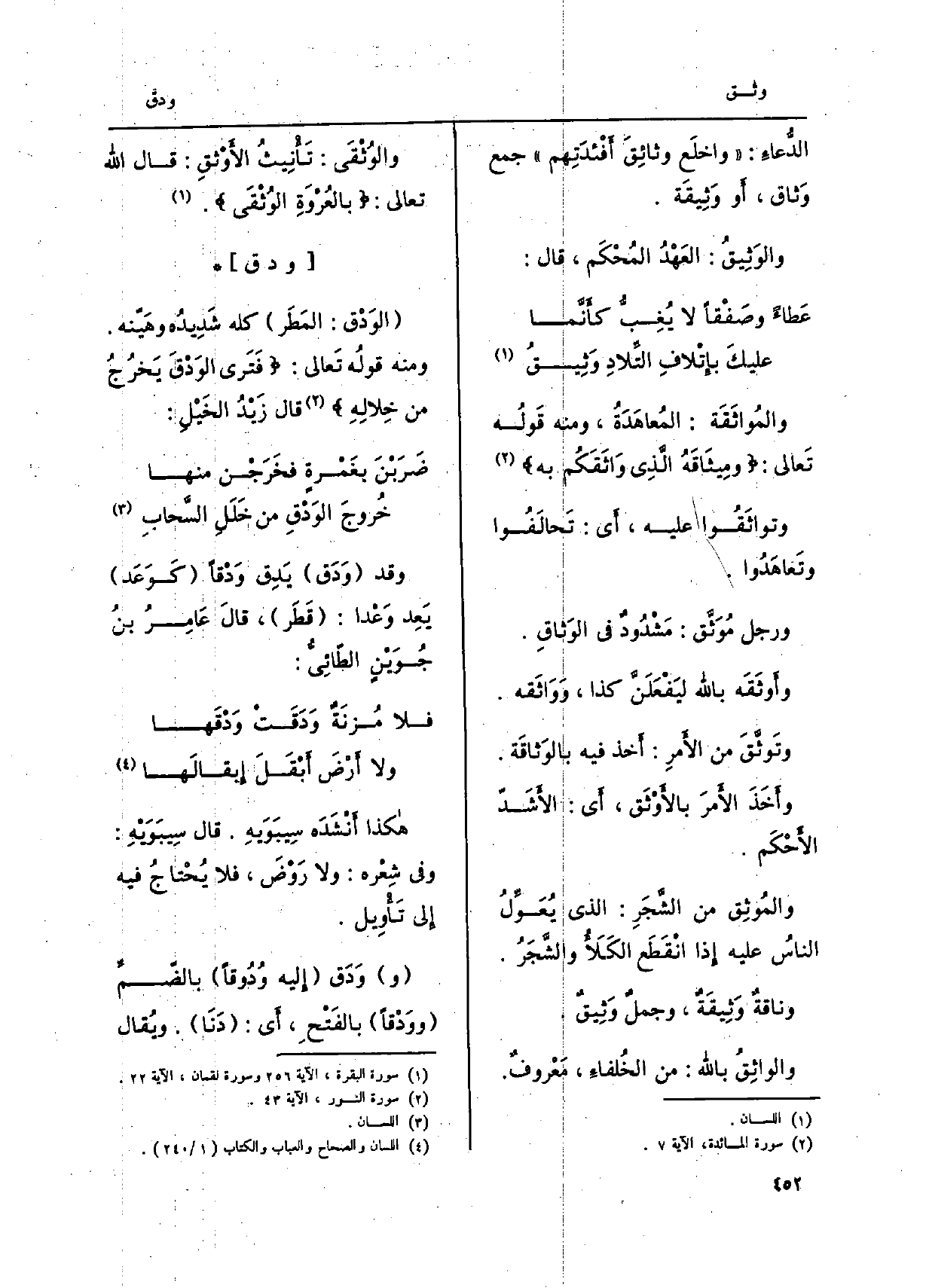 {والمُواثَقَة: المُعاهَدَةُ، وَمِنْه قولُه تَعالى:) } وميثاقَهُ الَّذِي {واثَقَكُم بِهِ (.} وتواثَقوا عَلَيْهِ، أَي: تحالَفوا وتعاهَدوا. وَرجل {موَثَّق: مشْدودٌ فِي} الوَثاقِ. {وأوثَقَه بِاللَّه ليَفْعَلَنّ كَذَا،} وواثَقه. {وتوثّقَ من الْأَمر: أَخذ فِيهِ} بالوَثاقَة. وأخذَ الأمرَ {بالأوْثَق، أَي: الأشَدّ الأحْكَم.} والمُوثِق من الشّجَر: الَّذِي يعَوِّلُ الناسُ عَلَيْهِ إِذا انْقَطَع الكلأُ والشّجَرُ. وناقةٌ {وثيقَةٌ، وجملٌ} وثيقٌ. {والواثِقُ بِاللَّه: من الخُلفاءِ، معْروفٌ.} والوُثْقَى: تأنيثُ {الأوْثَق: قَالَ الله تَعَالَى:) بالعُرْوَةِ} الوُثْقَى (.