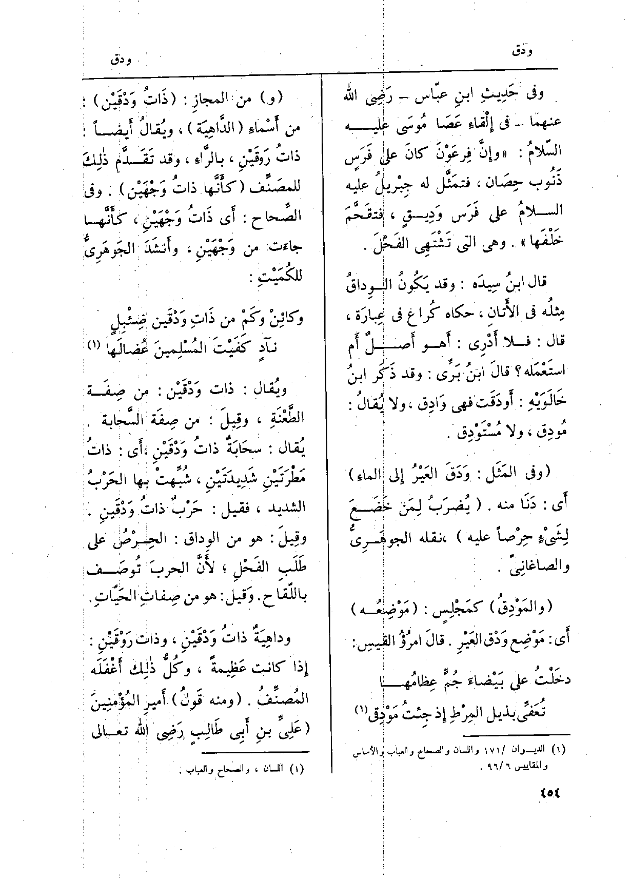 ويُقال: ذَات وَدْقَيْن: من صِفة الطّعْنَة، وَقيل: من صِفَة السّحابة. يُقال: سَحابَةٌ ذاتُ وَدْقَيْن، أَي: ذاتُ مَطْرَتَيْن شَديدَتَيْن، شُبِّهتْ بهَا الحرْبُ الشَّديد، فَقيل: حرْبٌ ذاتُ وَدْقَين. وَقيل: هُوَ من {الوِداق: الحِرْصُ على طَلَبِ الفَحْلِ لأنّ الحربَ توصَف باللّقاح. وَقيل: هُوَ من صِفاتِ الحيّاتِ.