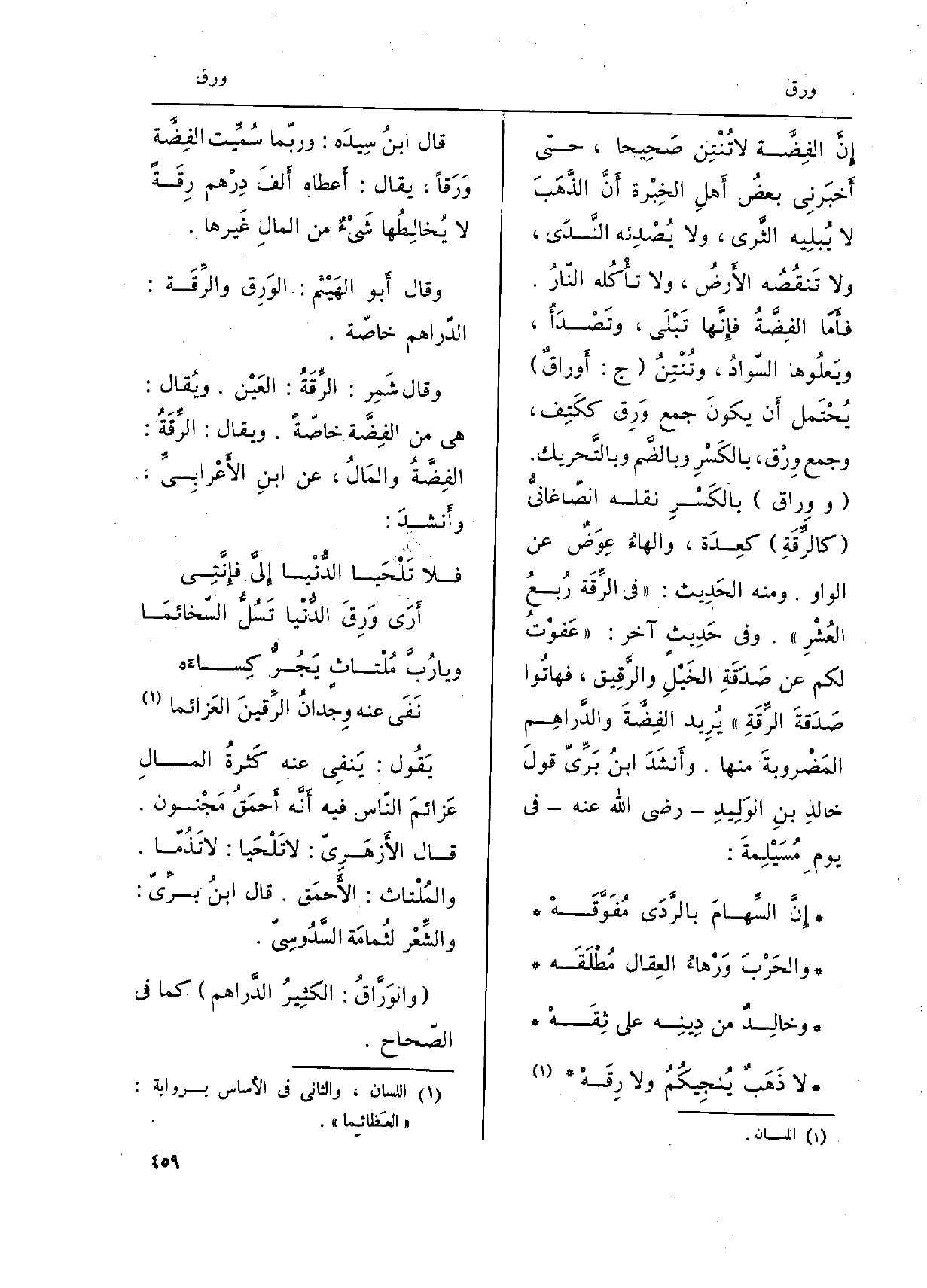 وَمِنْه الحَدِيث: فِي الرِّقَة رُبعُ العُشْر. وَفِي حَدِيث آخر: عفوْتُ لكم عَن صدَقَةِ الخيْل والرّقيق، فهاتُوا صَدَقَة {الرِّقَةِ يُريد الفِضّة والدّراهِم المضْروبةَ مِنْهَا. وأنشَدَ ابنُ برّي قولَ خالدِ بنِ الوَليد رَضِي الله عَنهُ فِي يومِ مُسَيْلِمة: إنّ السِّهامَ بالرّدَى مُفَوَّقَهْ والحرْبَ ورْهاءُ العِقال مُطْلَقَهْ وخالدٌ من دينِه على ثِقَهْ لَا ذهَبٌ يُنجيكُمُ وَلَا} رِقَهْ قَالَ ابنُ سيدَه: وربّما سُمِّيت الفِضّة {ورَقاً، يُقَال: أعطَاهُ ألفَ دِرْهم رِقَةً لَا يُخالِطُها شيْءٌ من المالِ غَيرهَا. وَقَالَ أَبُو الْهَيْثَم:} الوَرِق {والرِّقَة: الدّراهم خاصّة. وَقَالَ شَمِر:} الرِّقَة: العيْن.