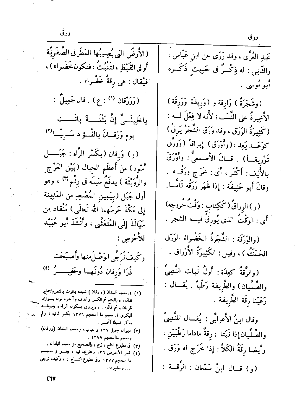 العُزّى، وَقد رَوى عَن ابنِ عبّاس، والثّاني: لَهُ ذِكْرٌ فِي حديثٍ ذكَره أَبُو مُوسَى. وشجَرَةٌ {وارِقة و} وريقَة {ووَرِقَة الأخيرةُ على النّسَب لِأَنَّهُ لَا فِعْلَ لَهُ: كثيرةُ} الوَرَق، وَقد {وَرَق الشّجَرُ} يرِقُ كوَعَد يعِد، {وأورَق} إيراقاً {وورّق} توْريقاً. قَالَ الأصمعيّ: {وأوْرَقَ بالألِف: أكْثَر، أَي: خرَج ورَقُه. وَقَالَ أَبُو حنيفَة: إِذا ظهَر ورَقُه تامّاً. (و) } الوِراقُ ككِتاب: وقْتُ خُروجِ أَي: الوقْت الَّذِي {يورِقُ فِيهِ الشّجر.} والوَرَقَة: الشّجرةُ الخضْراءُ {الوَرَق الحسَنَتُه، وَقيل: الكَثيرةُ} الأوْراق. {والرِّقةُ كعِدَة: أولُ نَبات النّصيِّ والصِّلِّيان والطّريفة رطْباً. يُقال: رَعَيْنا} رِقَة الطّريفة. وَقَالَ ابنُ الأعرابيّ: يُقال للنّصِيّ والصِّلِّيان إِذا نبَتا: رِقةٌ مَا داما رطْبَيْن، وَأَيْضًا رِقَةُ الْكلأ: إِذا خرَج لَهُ {وَرَق. وَقَالَ ابنُ سَمْعان:} الرِّقَة: الأرضُ الَّتِي يُصيبُها المطَر فِي الصّفَريّة أَو فِي القيْظ، فتَنْبُتُ، فَتكون خضْراءَ، فيُقال: هِيَ {رِقةٌ خضْراء.} ووَرْقان: ع. قَالَ جَميلٌ: