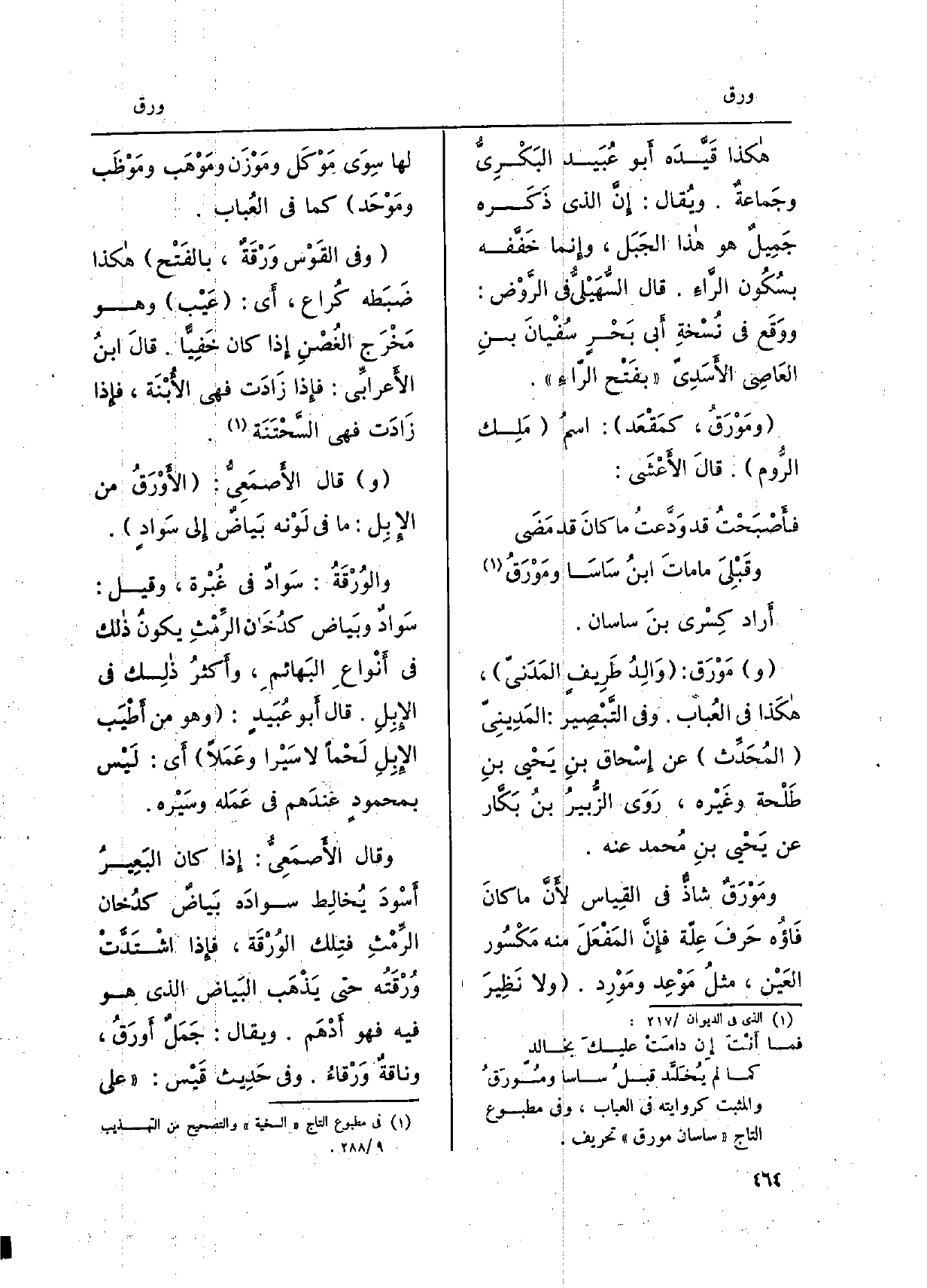 وَفِي القوْس} ورْقَةٌ، بالفَتْح هَكَذَا ضبَطه كُراع، أَي: عيْب وَهُوَ مَخْرَج الغُصْنِ إِذا كَانَ خفيّاً. قَالَ ابنُ الأعرابيّ: فَإِذا زادَت فَهِيَ الأُبْهَة، فَإِذا زادَت فَهِيَ السّحْتَنَة. وَقَالَ الأصمعيّ: {الأوْرَقُ من الإبِل: مَا فِي لوْنه بياضٌ الى سَوادٍ.} والوُرْقَة: سَوادٌ فِي غُبْرة، وَقيل: سَوادٌ وبَياض كدُخان)