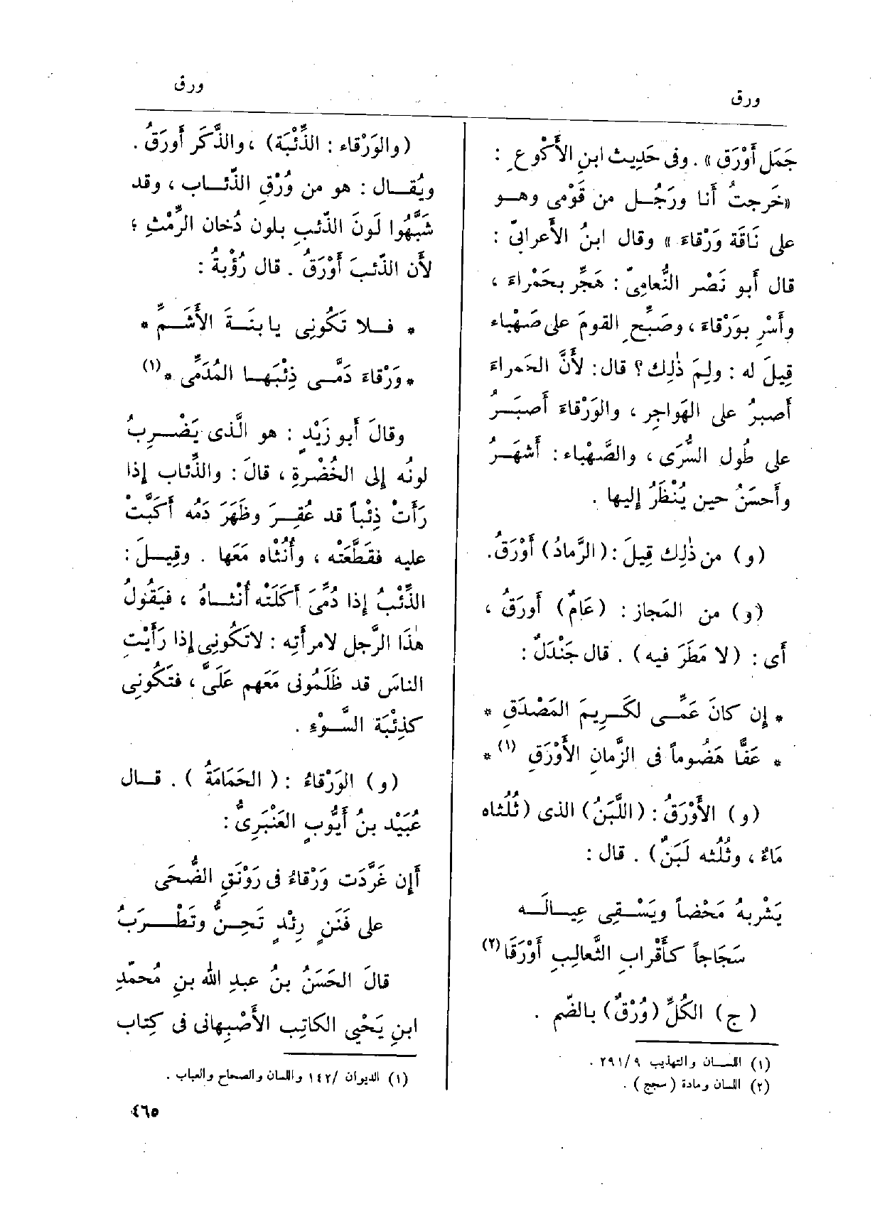 ج الكُلِّ {وُرْقٌ بالضّم.} والوَرْقاء: الذّئْبَة، والذّكَر {أورَقُ. ويُقال: هُوَ من وُرْقِ الذّئاب، وَقد شبّهوا لونَ الذّئب بلون دُخان الرِّمْثِ لِأَن الذّئبَ أوْرَقُ. قَالَ رؤبة: فَلَا تكونِي يَا بنَةَ الأشَمِّ ورْقاءَ دَمَّى ذِئْبَها المُدَمِّي وَقَالَ أَبُو زيد: هُوَ الَّذِي يَضرِبُ لونُه الى الخُضْرةِ، قَالَ: والذّئاب إِذا رأتْ ذِئْباً قد عُقِرَ وظهَرَ دمُه أكبّتْ عَلَيْهِ فقطّعَتْه، وأُنثاه معَها. وَقيل: الذّئْبُ إِذا دُمِّيَ أكلَتْه أنثاه، فَيَقُول هَذَا الرّجل لامرأتِه: لَا تَكُونِي إِذا رأيتِ الناسَ قد ظلَموني معَهم عليّ، فتكوني كذِئْبَة السَّوْء. (و) } الورْقاءُ: الحَمامةُ. قَالَ عُبيد بنُ أيّوبٍ العَنْبَريّ: