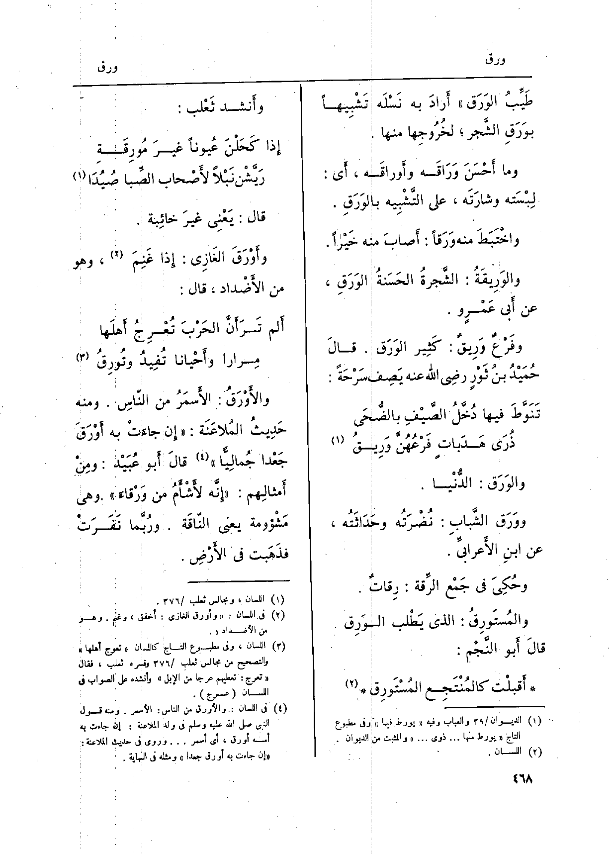 طيِّبُ {الوَرَق أرادَ بِهِ نسْلَه تشْبيهاً} بوَرَقِ الشّجر لخُروجِها مِنْهَا. وَمَا أحْسَنَ {وَراقَه} وأوراقَه، أَي: لِبْسَته وشارَتَه، على التّشْبيه بالوَرَقِ.