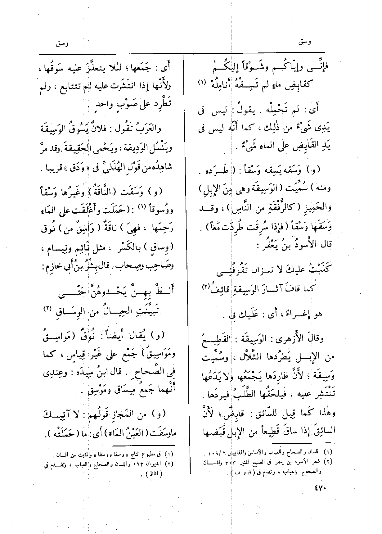 هُوَ إغراءٌ، أَي: عليْك بِي. وَقَالَ الأزهريّ:} الوَسيقَة: القَطيعُ من الْإِبِل يطرُدها الشّلاّل، وسُمّيت {وسيقَة لأنّ طارِدَها يجْمَعُها وَلَا يدَعُها تنتَشِر عَلَيْهِ، فيلحَقُها الطّلَبُ فيردّها. وَهَذَا كَمَا قيل للسّائق: قابِضٌ لأنّ السائِقَ إِذا ساقَ قَطيعاً من الإبِل قبَضها أَي: جمَعَها لِئَلَّا يتعذّرَ عَلَيْهِ سوقُها، ولأنّها إِذا انتَشَرت عَلَيْهِ لم تتتابع، وَلم تطّرِد على صوْبٍ وَاحِد. والعَرَبُ تَقول: فلانٌ يسوقُ} الوَسيقَة وينْسُل الوَديقة، ويَحْمي الحَقيقةَ. وَقد مرّ شاهِدُه من قوْل الهُذَليّ فِي وَدَق قَرِيبا.