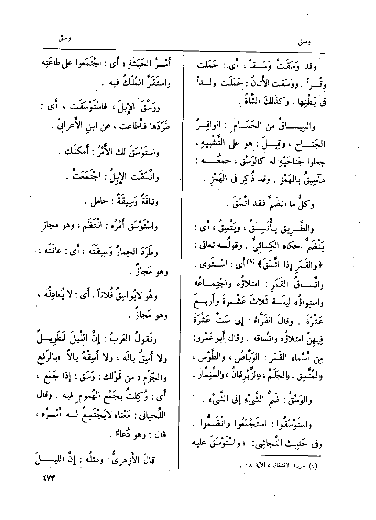 وَقد {وسَقَتْ} وسْقاً، أَي: حمَلت وِقْراً. {ووَسَقت الأتانُ: حمَلَت ولدا فِي بطْنِها، وَكَذَلِكَ الشّاةُ.} والميساقُ من الحَمام: الوافِرُ الجَناح، وَقيل: هُوَ على التّشْبيهِ، جعلُوا جَناحَيْهِ لَهُ {كالوَسْق، جمعُه:} مآسيقُ بالهَمْز. وَقد ذُكِر فِي الهَمْزِ. وكلّ مَا انضَمّ فقد {اتّسَق. والطّريق يأْتَسِقُ،} ويتّسِقُ، أَي: ينْضَمّ، حَكَاهُ الكِسائيّ. وقولُه تَعَالَى:) والقَمَرِ إِذا {اتّسَقَ (أَي: استَوى.} واتِّساقُ القَمَر: امتلاؤه واجْتِماعُه واستِواؤُه ليلَة ثَلاثَ عشْرةَ وأربَعَ عشْرَةَ. وَقَالَ الفرّاءُ: الى سرَّ عشْرةَ فيهِنّ امتلاؤُه {واتّساقه.