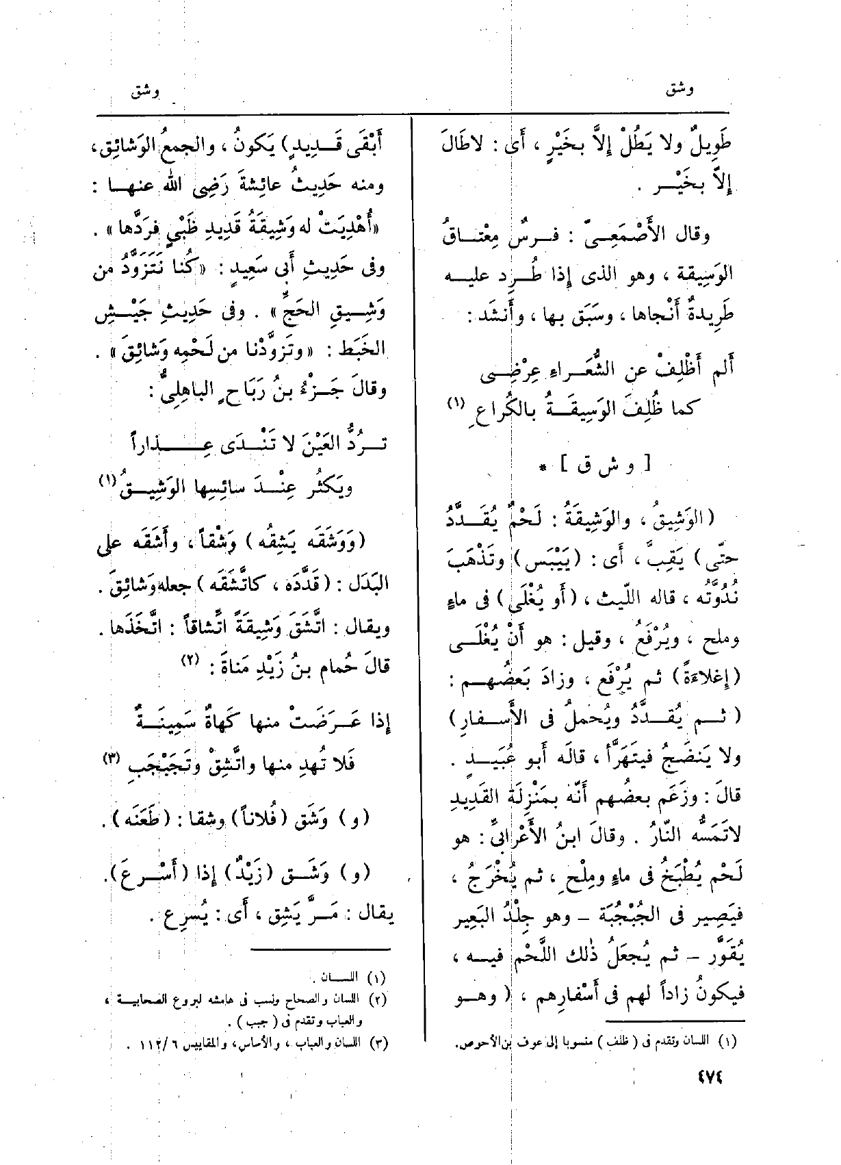 {الوَشيقُ،} والوَشيقَةُ: لحْمٌ يُقَدَّدُ حَتَّى يقِبَّ، أَي: ييْبَس وتذْهَبَ نُدوَّتُه، قَالَه اللّيث، أَو يُغْلَى فِي ماءٍ وملح، ويُرْفَع، وَقيل: هُوَ أَن يُغْلَى إغلاءَةً ثمَّ يُرْفَع، وزادَ بعضُهم: ثمَّ يُقدَّدُ ويُحملُ فِي الأسفارِ وَلَا ينْضَجُ فيتهرّأ، قالَه أَبُو عبيد. قَالَ: وزعَم بعضُهم أنّه بمنزِلَة القَديدِ لَا تَمَسُّه النّارُ. وَقَالَ ابنُ الأعرابيّ: هُوَ لحْم يُطْبَخُ فِي ماءٍ ومِلْحِ، ثمَّ يُخْرَجُ، فيَصير فِي الجُبْجُبَة وَهُوَ جِلدُ البَعير يُقَوَّر ثمَّ يفجعَلُ ذَلِك اللّحْم فِيهِ، فيكونُ زاداً لَهُم فِي أسْفارِهم، وَهُوَ أبْقَى قَديد يكون، والجمعُ {الوَشائِق، وَمِنْه حديثُ عائِشَة رَضِي الله عَنْهَا: أُهْديَتْ لَهُ} وَشيقَةُ قَديدِ ظَبْيٍ فردّها. وَفِي حديثِ أبي سَعيدٍ: كُنا نتزوَّدُ من {وَشيقِ الحجّ. وَفِي حَدِيث جيْشِ الخَبَط: وتزوّدْنا من لحْمِه} وشائِقَ.
