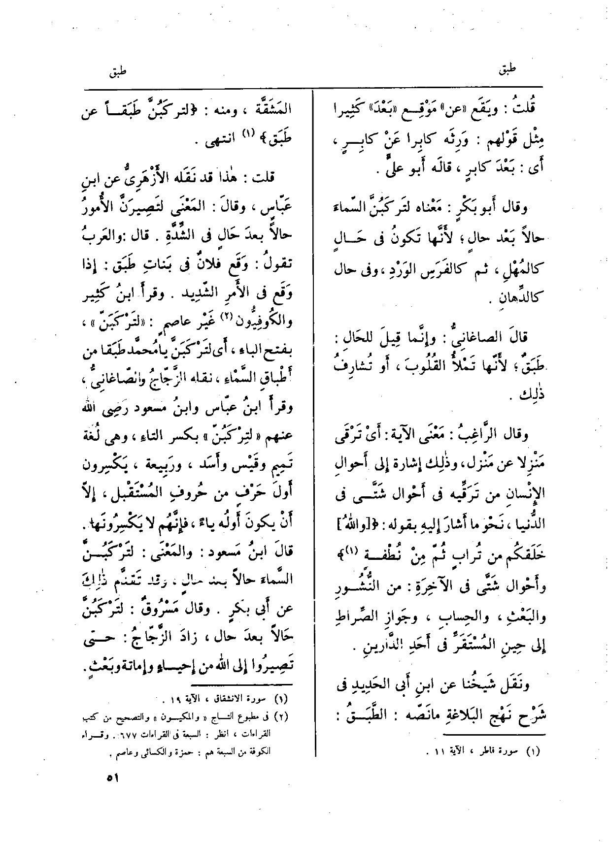 قلتُ: ويقَع عَن موقِع بعْدَ كَثيراً مثْل قوْلهم: ورِثَه كابِراً عَن كابِرٍ، أَي: بعْدَ كابرٍ، قالَه أَبُو عليّ. وَقَالَ أَبُو بكر: معْناه لتَركَبُنّ السّماءَ حَالا بعْدَ حالٍ لأنّها تكون فِي حالٍ كالمُهْلِ، ثمَّ كالفَرَسِ الوَرْدِ، وَفِي حَال كالدِّهان. قَالَ الصاغانيّ: وإنّما قيلَ للْحَال: طبَقٌ لأنّها تمْلأُ القُلوبَ، أَو تُشارِفُ ذلِك. وَقَالَ الرّاغِب: معنى الْآيَة: أَي تَرْقَى منزِلاً عَن منْزِل، وذلِك إِشَارَة الى أحوالِ الإنسانِ من ترَقّيه فِي أحْوال شتّى فِي الدُنْيا، نحْو مَا أَشَارَ إليهِ بقوله:) واللهُ خلَقكُم من تُرابٍ ثمّ من نُطْفَةٍ (وأحوال شتّى فِي الآخرَةِ: من النُّشورِ والبَعْثِ، والحِسابِ، وجوازِ الصِّراطِ الى حينِ المُسْتَقَرِّ فِي أحدِ الدّارينِ. ونقَل شيخُنا عَن ابنِ أبي الحَديد فِي شرْح نهْج البلاغةِ مَا نصّه: الطَّبَقُ: المشقّة، وَمِنْه:) لتركَبُنّ طبَقاً عَن طَبَق (انْتهى. قلت: هَذَا قد نقَله الأزْهريّ عَن ابنِ عبّاس، وَقَالَ: المَعْنى لتَصيرنّ الأمورُ حَالا بعدَ حالٍ فِي الشّدّةِ. قَالَ: والعَربُ تقولُ: وقَع فلانٌ فِي بَناتِ طَبَق: إِذا وقَع فِي الْأَمر الشّديد. وَقَرَأَ ابنُ كَثير والكوفيّون غيْر عاصمٍ: لتَرْكَبَنّ، بِفَتْح الباءِ، أَي لترْكَبَنّ يَا مفحمّد طبَقاً من أطْباقِ السّماءِ، نَقله الزّجّاجُ والصّاغانيّ، وَقَرَأَ ابنُ عبّاس وابنُ مَسْعُود رَضِي الله عَنْهُم لتِرْكَبُنّ بِكَسْر التاءِ، وَهِي لُغة تَميم وقَيْس وأسَد، وَرَبِيعَة، يكْسِرون أولَ حرْفٍ من حُروفِ المُستقبل، إِلَّا أَن يكونَ أولُه يَاء، فإنّهم لَا يَكْسِرونَها. قَالَ ابنُ مَسْعُود: والمَعْنى: لتَرْكَبُنّ السّماءَ حَالا بعد حالٍ، وَقد تقدّم ذلِك عَن أبي بكر. وَقَالَ مَسْروقٌ: لتَرْكَبُنّ حَالا بعدَ حَال، زادَ الزّجاجُ: حَتَّى تَصيروا الى الله من إحياءٍ وإماتة وبعْثٍ.