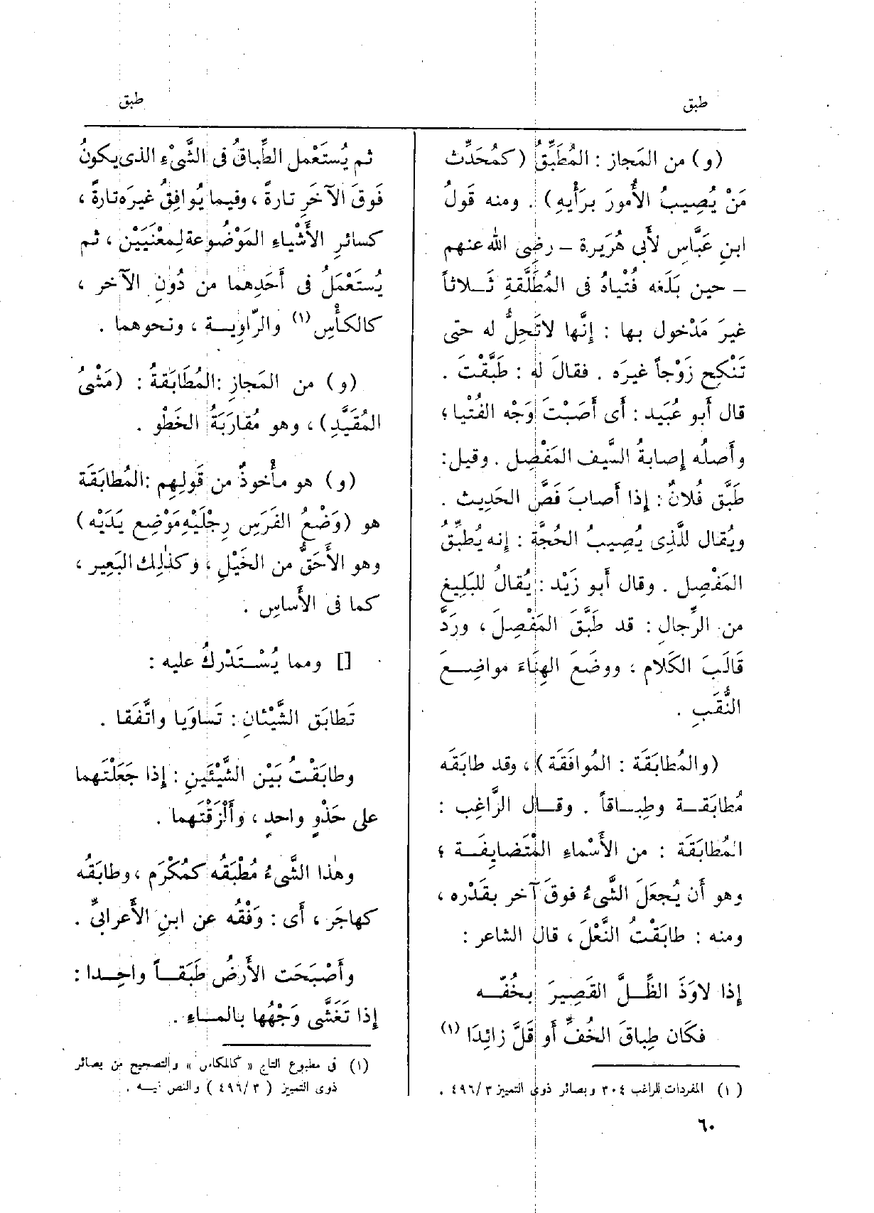 ثمَّ يُستَعْمل الطِّباقُ فِي الشّيءِ الَّذِي يكونُ فوقَ الآخَر تَارَة، وَفِيمَا يُوافِق غيرَه تَارَة، كسائِرِ الأشياءِ الْمَوْضُوعَة لمعْنَيَيْن، ثمَّ يُستَعمَلُ فِي أحدِهما من دونِ الآخر، كالكأسِ والرّاوِية، وَنَحْوهمَا. وَمن المَجاز: المُطابَقة: مَشْيُ المُقَيَّد، وَهُوَ مُقارَبَةُ الخَطْو. وَهُوَ مأخوذٌ من قولِهم: المُطابَقَة هُوَ وضْعُ الفَرَس رِجْلَيْهِ موضِع يَدَيْه وَهُوَ الأحَقُّ من الخَيْلِ، وكذلِك البَعير، كَمَا فِي الأساسِ. وَمِمَّا يُسْتَدرَك عَلَيْهِ: تطابَق الشّيئانِ: تَساوَيا واتّفَقا. وطابَقْتُ بيْن الشّيْئَين: إِذا جعَلْتَهما على حَذْوٍ واحدٍ، وألزَقْتَهما. وَهَذَا الشّيءُ مُطْبَقُه كمُكْرَم، وطابَقهُ كهاجَر، أَي: وَفْقه عَن ابنِ الْأَعرَابِي. وأصبَحَت الأرضُ طَبَقاً واحِداً: إِذا تغشّى وجهُها بالماءِ.