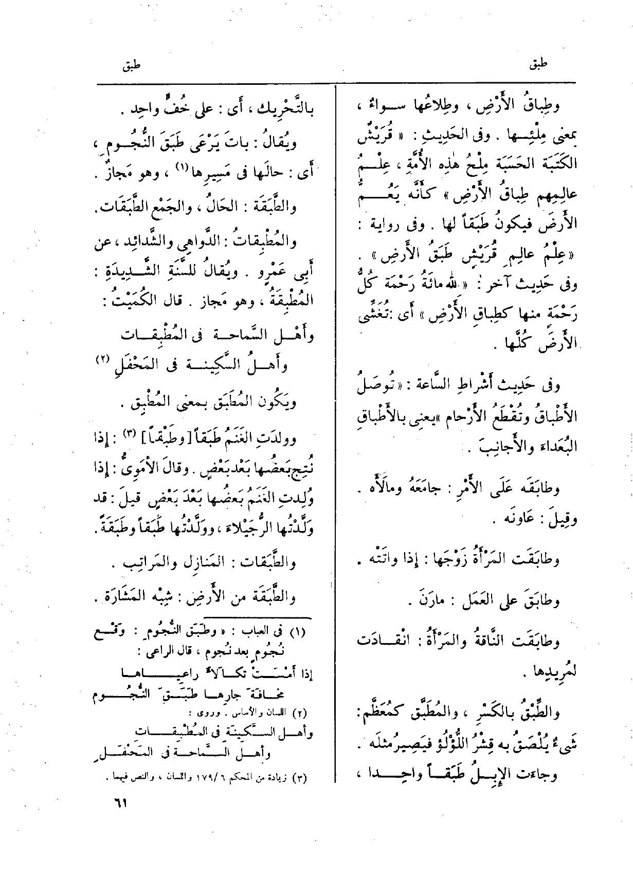 وطِباقُ الأرضِ، وطِلاعُها سَواءٌ، بِمَعْنى مِلْئِها. وَفِي الحَديث: قُرَيْشٌ الكَتَبة الحَسَبَة مِلْحُ هذِه الأمّةِ، عِلْمُ عالِمِهم طِباقُ الأرضِ كأنّه يعُمُّ الأرضَ فيكونُ طَبَقاً لَهَا. وَفِي رِوَايَة: عِلْمُ عالِمِ قُريْش طَبَقُ الأَرْض. وَفِي حَديث آخر: لله مائَةُ رَحْمَة كُلُّ رَحْمَةٍ مِنْهَا كطِباقِ الأرضِ أَي: تُغَشِّي الأرضَ كُلَّها. وَفِي حَديث أشْراطِ السّاعة: توصَلُ الأطْباقُ وتُقطَعُ الأرْحام يعنِي بالأطْباقِ البُعَداءَ والأجانِبَ.