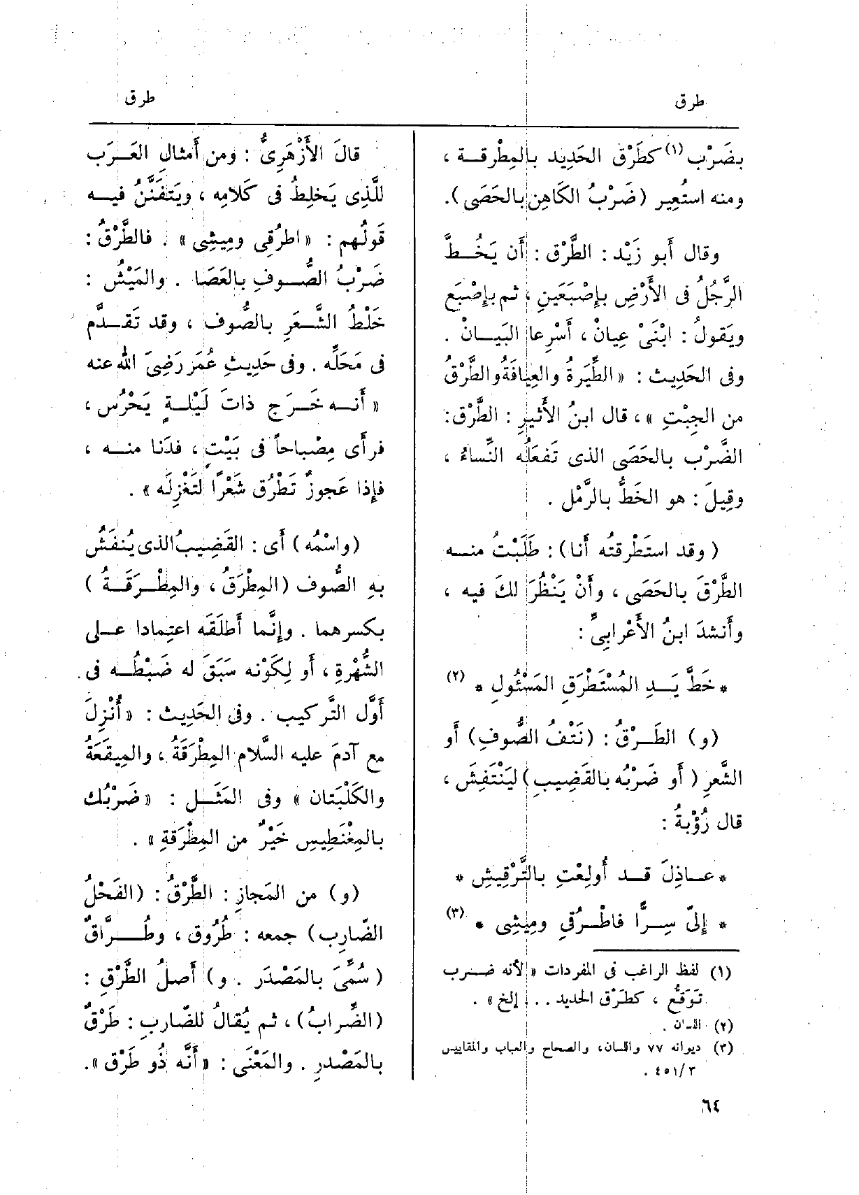 بالمِطْرقة، وَمِنْه استُعِير ضرْبُ الكاهِن بالحَصَى. وَقَالَ أَبُو زَيْد: الطّرْق: أَن يَخُطَّ الرّجُل فِي الأرضِ بإصْبَعَيْن، ثمَّ بإصْبَع ويَقول: ابْنَيْ عِيانْ، أسْرِعا البَيانْ. وَفِي الحَديث: الطِّيَرةُ والعِيافَةُ والطّرْقُ من الجِبْتِ، قَالَ ابنُ الْأَثِير: الطّرْق: الضّرْب بالحَصَى الَّذِي تفعَلُه النِّساءُ، وقيلَ: هُوَ الخَطُّ بالرّمْل. وَقد استَطْرقتُه أَنا: طَلَبْتُ مِنْهُ الطّرْقَ بالحَصَى، وأنْ ينْظُر لكَ فِيهِ، وأنشدَ ابنُ الأعرابيّ: خَطَّ يَدِ المُستَطرَقِ المَسْئولِ والطَرْقُ: نتْفُ الصّوف أَو الشَّعرِ أَو ضرْبُه بالقَضيبِ لينْتَفِشَ، قَالَ رؤبة: عاذِلَ قد أولِعْتِ بالتّرْقِيشِ إليَّ سِرّاً فاطْرُقِي ومِيشي قَالَ الأزهريُّ: وَمن أَمْثَال العَرَب للّذي يخلِطُ فِي كَلامِه، ويتفنّنُ فِيهِ قولُهم: اطرُقي ومِيشي.