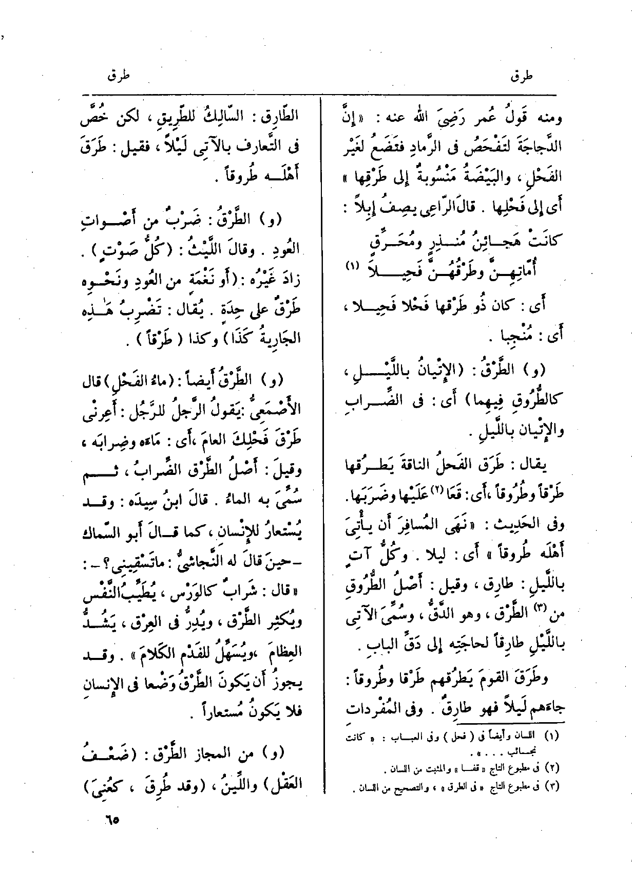 وطرَقَ القومَ يطرُقهم طرْقاً وطُروقاً: جاءَهم لَيلاً فَهُوَ طارِقٌ. وَفِي المُفرداتِ الطّارِق: السّالِكُ)