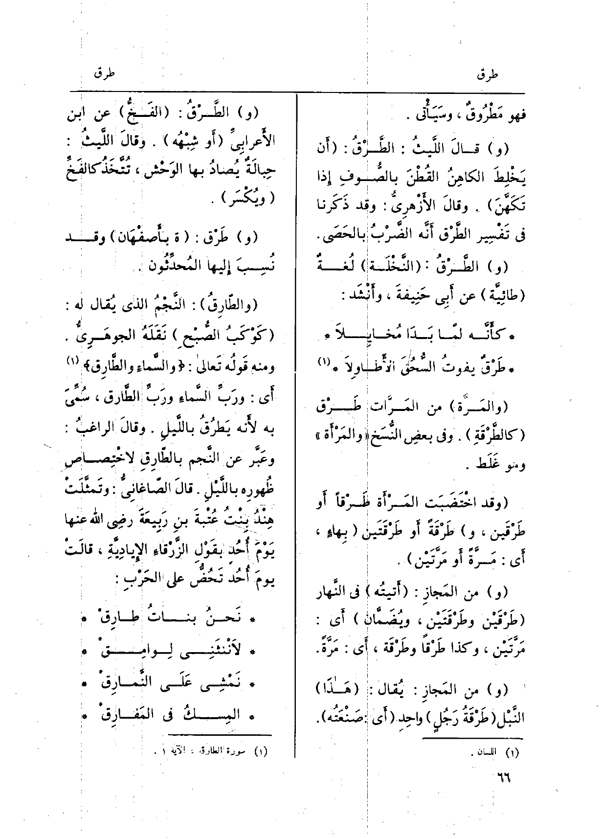 والطّارِقُ: النّجْمُ الَّذِي يُقال لَهُ: كوكَبُ الصُبْح نقَلَه الجوهريُّ. وَمِنْه قولُه تَعالى:) والسّماءِ والطّارِق (أَي: ورَبِّ السّماءِ وربِّ الطّارق، سُمِّيَ بِهِ لِأَنَّهُ يطرُقُ باللّيلِ. وَقَالَ الراغبُ: وعبّر عَن النّجم بالطّارِقِ لاختِصاص ظُهورِه باللّيْل. قَالَ الصّاغانيّ: وتمثّلَتْ هِنْدُ بنتُ عُتْبَة بنِ رَبيعةَ رضيَ الله عَنْهَا يومَ أحُدٍ بقَوْلِ الزّرْقاءِ الإياديّة، قَالَت يومَ أحُد تحُضّ على الحرْب: نحنُ بناتُ طارِقْ لَا نَنثَني لوامِقْ نمْشي علَى النّمارِقْ المِسكُ فِي المَفارِقْ)