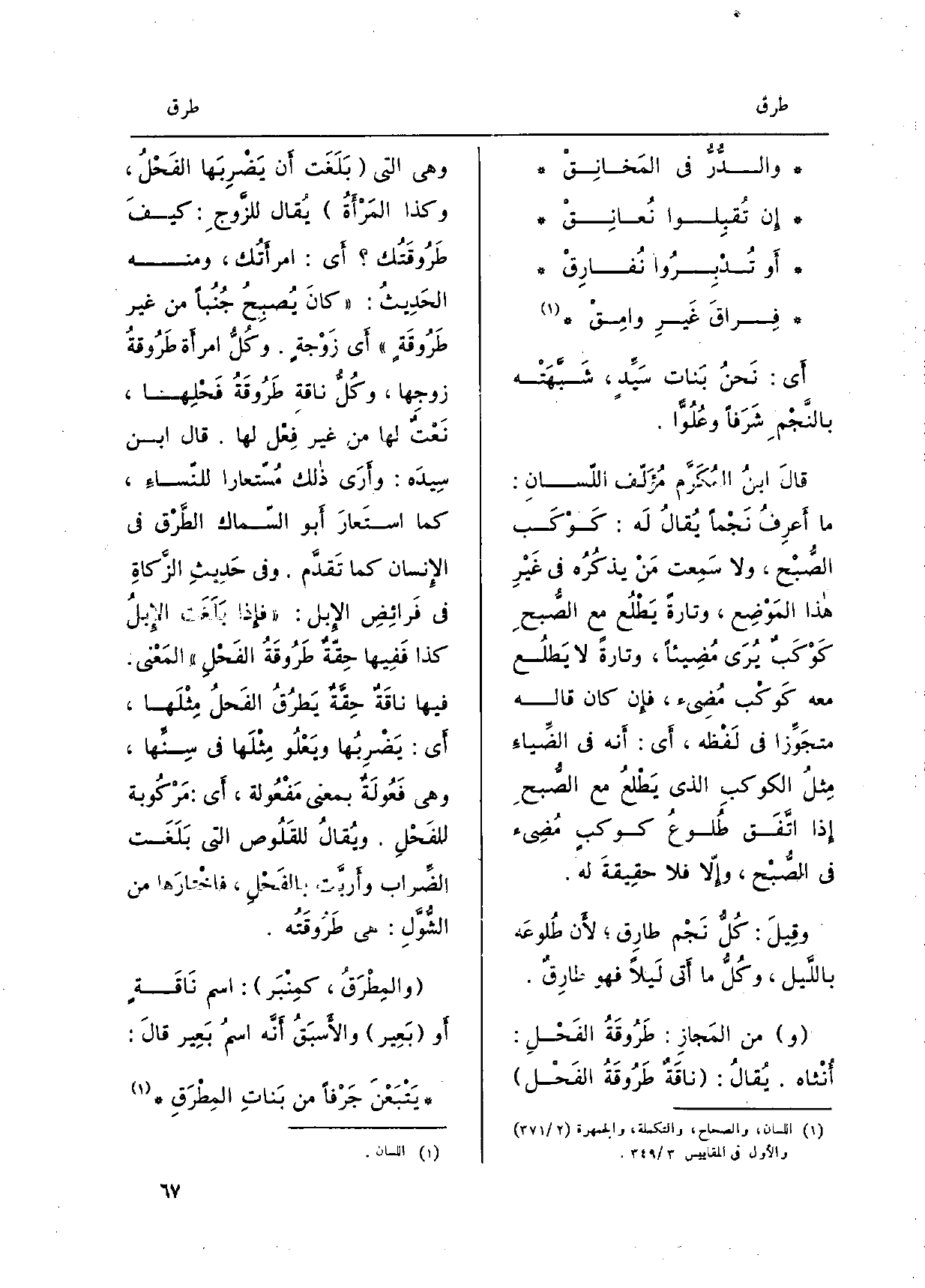 والدُّرُّ فِي المَخانِقْ إِن تُقبِلوا نُعانِقْ أَو تُدْبِروا نُفارِقْ فِراقَ غيرِ وامِقْ أَي: نحنُ بَنَات سيِّدٍ، شبّهَتْه بالنّجْمِ شرَفاً وعُلُوّاً. قالَ ابنُ المكرَّم مُؤلّف اللّسان: مَا أعرِفُ نجْماً يُقال لَهُ: كوكَبُ الصُبْح، وَلَا سمِعت مَنْ يذكرُه فِي غيرِ هَذَا الموضِع، وَتارَة يطْلُع مَعَ الصُبحِ كوكَبٌ يُرَى مُضِيئاً، وَتارَة لَا يَطلُع مَعَه كَوْكَب مضيء، فَإِن كَانَ قَالَه متجَوِّزاً فِي لفظِه، أَي: أَنه فِي الضِّياءِ مثلُ الْكَوْكَب الَّذِي يطْلُع مَعَ الصُبحِ إِذا اتّفَق طُلوعُ كوكبٍ مُضيء فِي الصُبْح، وإلاّ فَلَا حَقيقةَ لَهُ. وقيلَ: كلُّ نجْم طارِق لِأَن طُلوعَه باللّيل، وكُلُّ مَا أَتَى لَيلاً فَهُوَ طارِقٌ.