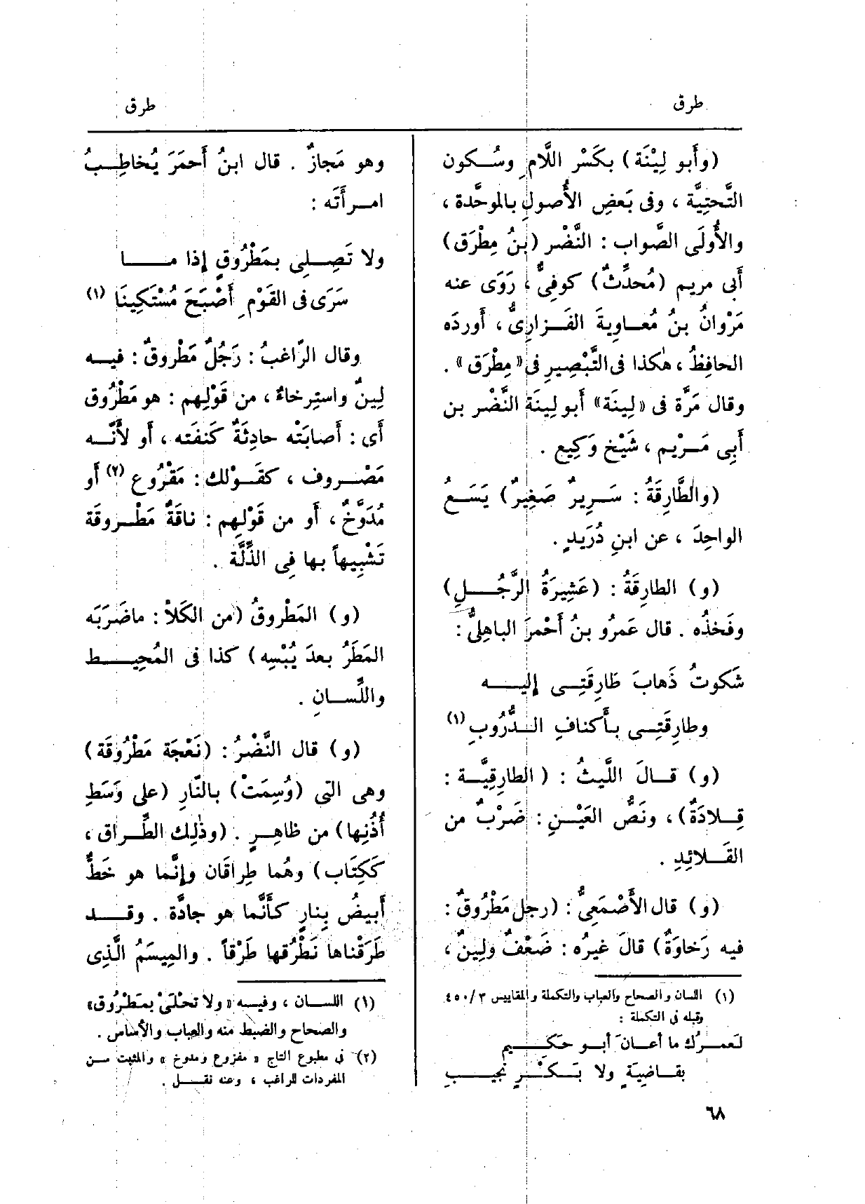 وَقَالَ اللّيثُ: الطارِقيّة: قِلادَةٌ، ونصُّ العَيْنِ: ضرْبٌ من القَلائِدِ. وَقَالَ الْأَصْمَعِي: رجل مَطْروقٌ: فِيهِ رَخاوَةٌ قَالَ غيرُه: ضعْفٌ ولين، وَهُوَ مجازٌ. قَالَ ابنُ أحمَرَ يُخاطِبُ امرأتَه: