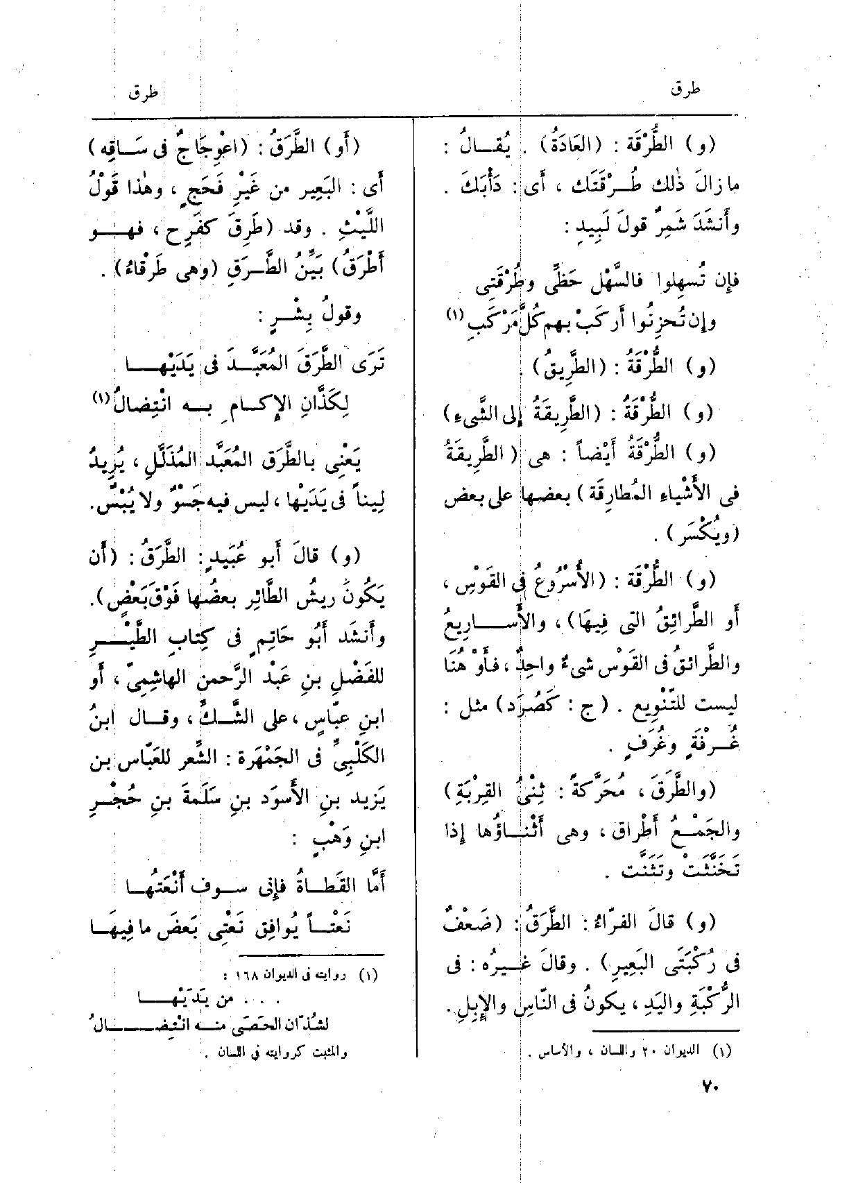 يَعْنِي بالطَّرَق المُعبَّد المُذَلَّلِ، يُريد لِيناً فِي يَدَيها، لَيْسَ فِيهِ جَسْوٌ وَلَا يُبْسٌ. وَقَالَ أَبُو عُبيد: الطّرَق: أَن يكونَ ريشُ الطّائرِ بعضُها فوقَ بعْض. وأنشَد أَبُو حاتِم فِي كِتاب الطّيْر للفضْلِ بنِ عبْد الرّحمن الهاشِميّ، أَو ابنِ عبّاس، على الشّكِّ، وَقَالَ ابنُ الكَلْبيِّ فِي الجَمْهَرة: الشّعر للعَبّاس بن يَزيد بنِ الأسوَد بنِ سَلَمة بنِ حُجْر بنِ وهْب: