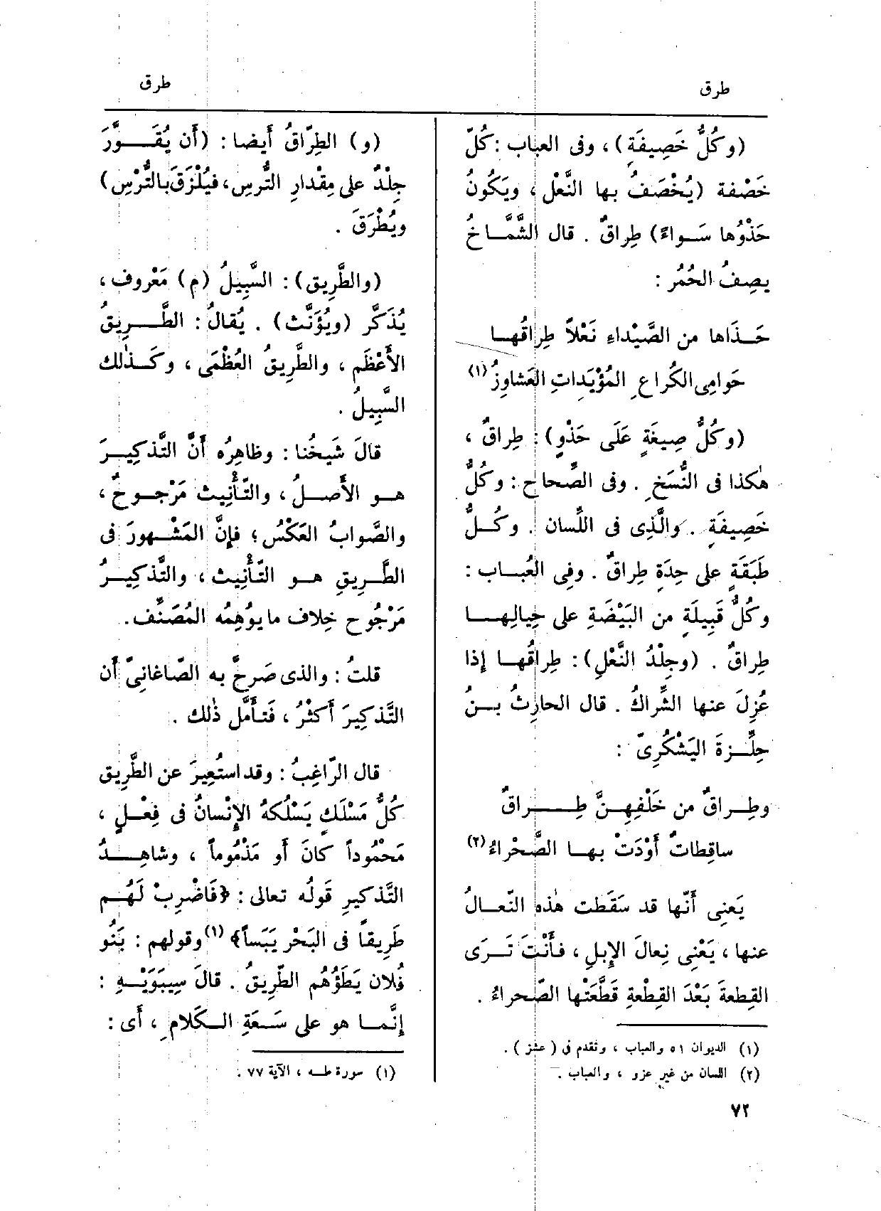 والطّريق: السّبيلُ م مَعروف، يُذكّر ويؤنَّث. يُقال: الطّريقُ الأعْظَم، والطّريقُ العُظْمى، وَكَذَلِكَ السّبيل. قَالَ شيخُنا: وظاهِرُه أنّ التّذكيرَ هُوَ الأصلُ، والتّأنيثُ مرْجوحٌ، والصّوابُ العَكْس فإنّ المشهورَ فِي الطّريق هُوَ التّأْنيث، والتّذكيرُ مرْجوح خِلاف مَا يوهِمُه المصنِّف. قلت: وَالَّذِي صرّح بِهِ الصّاغانيّ أَن التّذكيرَ أكثرُ، فتأمّل ذَلِك. قَالَ الراغبُ: وَقد استُعيرَ عَن الطَّرِيق كُلّ مسْلَكٍ يسْلُكه الإنسانُ فِي فِعْلٍ، محْموداً كَانَ أَو مذْموماً، وشاهِد التّذكير قولُه تَعَالَى:) فاضْرِبْ لهُم طَريقاً فِي البَحْر يَبَساً (وَقَوْلهمْ: بَنو فُلان يطؤهُم الطّريقُ. قَالَ سيبَوَيْه: إنّما هُوَ على سَعَةِ الكَلامِ، أَي: