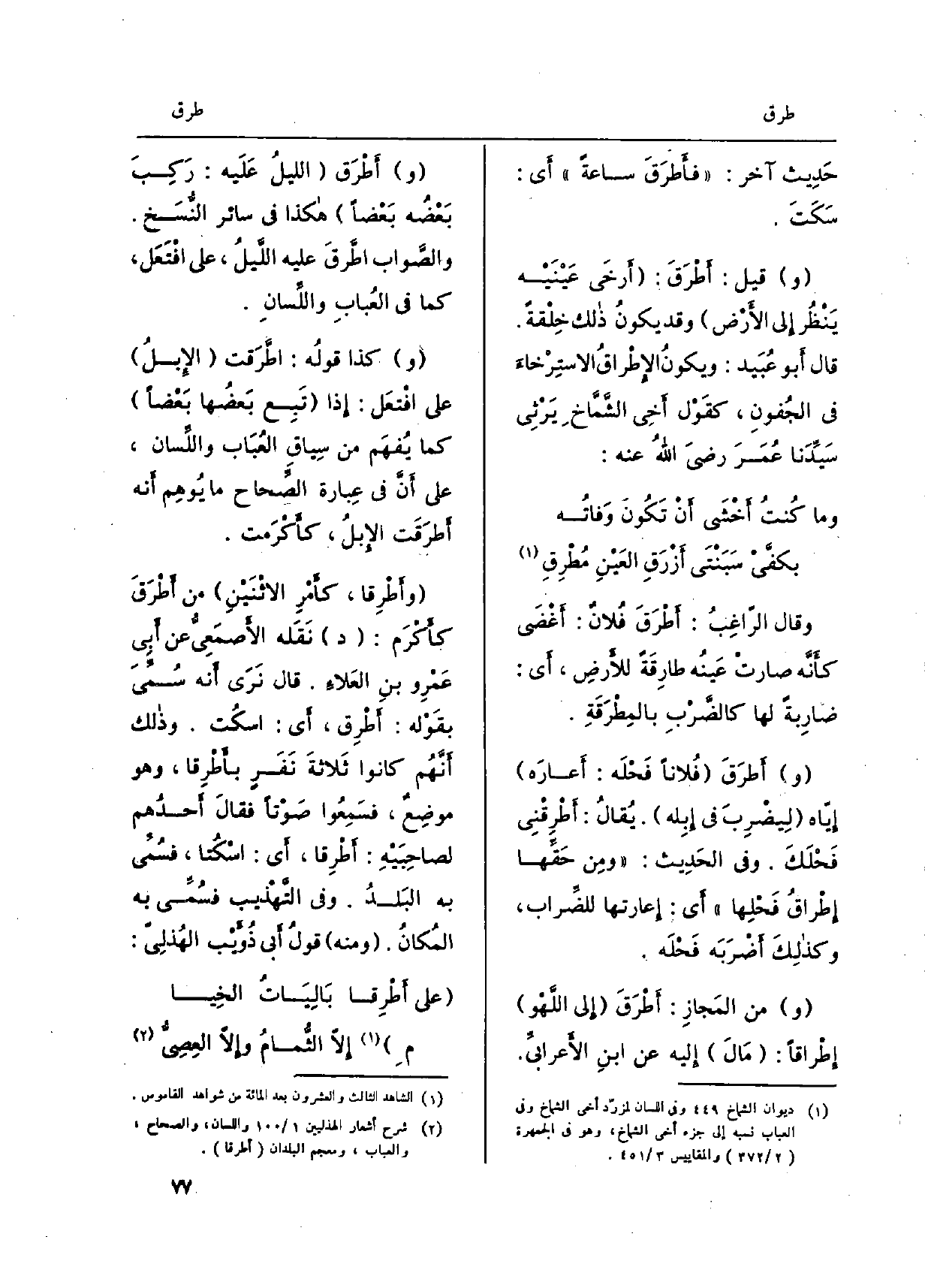 وَكَذَا قولُه: اطّرَقت الإبلُ على افْتَعل: إِذا تبِع بعضُها بعْضاً كَمَا يُفهَم من سِياقِ العُباب واللِّسان، على أنّ فِي عِبارة الصِّحاح مَا يوهِم أنّه أطرَقَت الإبلُ، كأكْرَمت. وأطْرِقا، كأمْرِ الاثْنَيْن من أطْرَقَ كأكْرَم: د نقَله الأصمَعيُّ عَن أبي عمْرو بنِ العَلاءِ. قَالَ نَرى أَنه سُمّي بقوْلِه: أطْرِق، أَي: اسكُت. وَذَلِكَ أنّهم كَانُوا ثَلاثةَ نفَرٍ بأطْرِقا، وَهُوَ موضِعٌ، فسَمِعوا صوْتاً فَقَالَ أحدُهم لصاحِبَيْه: أطْرِقا، أَي: اسْكتا، فسُمّي بِهِ البَلدُ. وَفِي التّهْذيب فسُمّي بِهِ المُكان. وَمِنْه قَول أبي ذُؤيْب الهُذْلي: