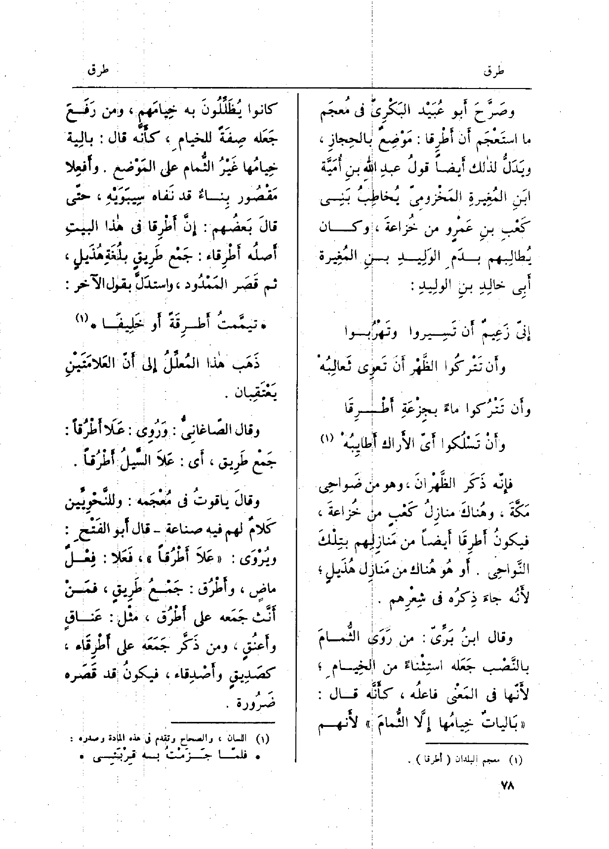 قَالَ: بالِية خِيامُها غيْرُ الثُّمام على المَوْضِع. وأفعِلا مَقْصور بِناءٌ قد نَفَاهُ سيبَوَيْهِ، حَتَّى قَالَ بعضُهم: إنّ أطْرِقا فِي هَذَا الْبَيْت أصلُه أطرِقاء: جمْع طَريقٍ بلغَة هُذَيل، ثمَّ قصَر الممْدود، واستدلّ بقول الآخر: تيمّمتُ أطرِقَةً أَو خَليفَا ذهَبَ هَذَا المُعلِّلُ الى أَن العَلامَتَيْن يعْتَقِبان. وَقَالَ الصّاغانيّ: ورُوِي: عَلا أطْرُقاً: جمْع طَريق، أَي: عَلا السّيلُ أطرُقاً. وَقَالَ ياقوتُ فِي مُعْجَمِه: وللنّحْويّين كلامٌ لَهُم فِيهِ صناعَة قَالَ أَبُو الفتْح: ويُرْوَى: عَلا أطْرُقاً، فَعَلا: فِعْلٌ ماضٍ، وأطْرُق: جمْعُ طَريقٍ، فمَنْ أنّث جمَعَه على أطْرُق، مثل: عَناقٍ وأعنُق، وَمن ذكّر جمَعَه على أطْرِقاء، كصَديقٍ وأصدِقاء، فيكونُ قد قصَره ضَرورة.