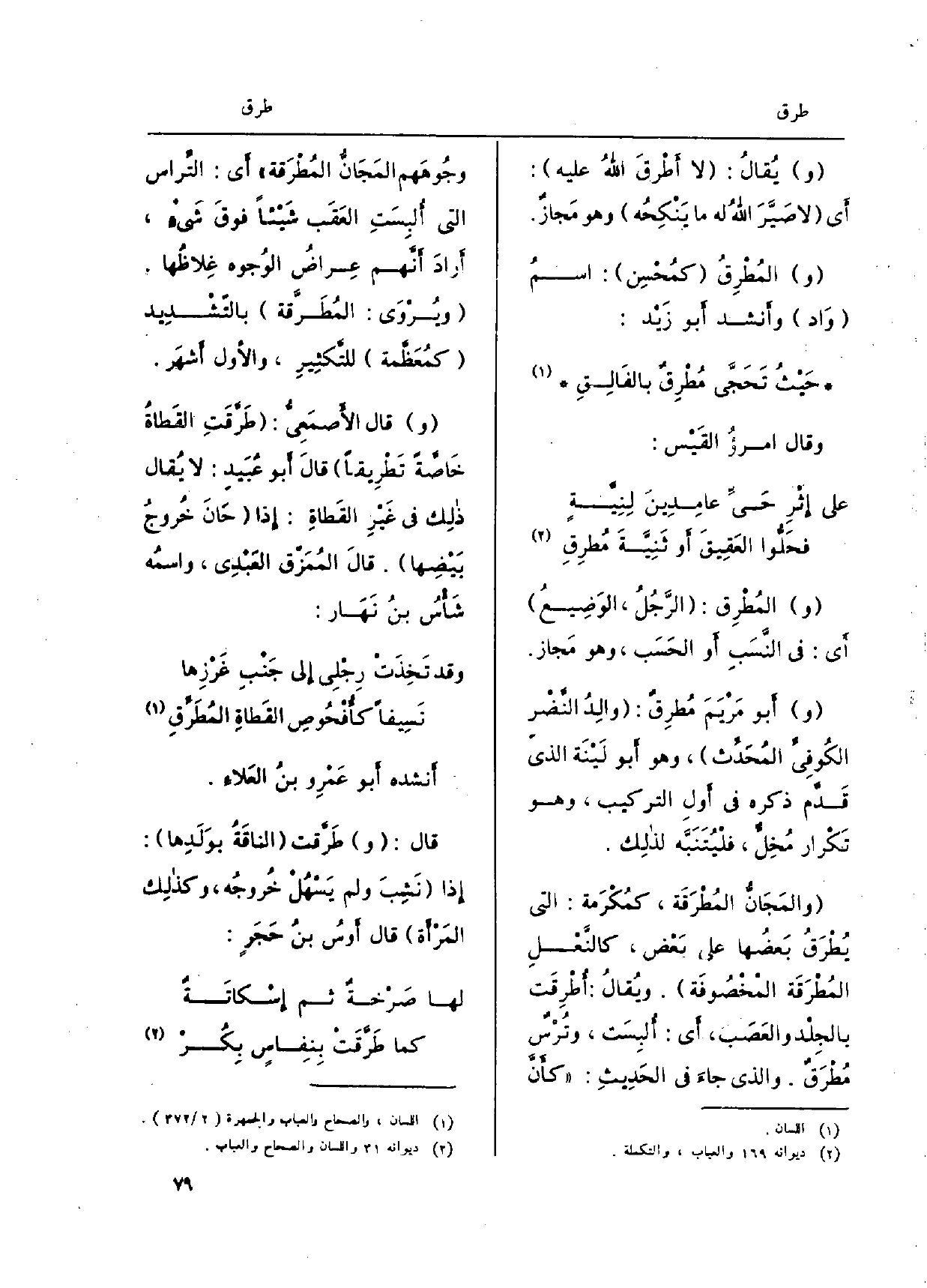 والمُطْرِق: الرّجُلُ، الوَضيعُ أَي: فِي النّسَب أَو الحسَب، وَهُوَ مَجاز. وَأَبُو مَرْيَمَ مُطرِقٌ: والِدُ النّضْر الكوفيِّ المحدِّث، وَهُوَ أَبُو لَيْنَة الَّذِي قدّك ذكره فِي أول التّركيب، وَهُوَ تَكْرار مُخِلٌّ، فلْيُتنَبّه لذلِك. والمَجَانُّ المُطْرَقَة، كمُكْرَمة: الَّتِي يُطْرَقُ بعضُها على بعْض، كالنّعْلِ المُطْرَقَة المخْصوفَة. ويُقال: أُطْرِقَت بالجِلْد والعصَب، أَي: أُلبِسَت، وتُرْسٌ مُطْرَقٌ. وَالَّذِي جاءَ فِي الحَديث: كأنّ وجوهَهم المَجَانُّ المُطْرَقة أَي: التِّراس الَّتِي أُلِسَت العَقَب شيْئاً فوقَ شَيءٍ، أرادَ أنّهم عِراضُ الْوُجُوه غِلاظُها. ويُرْوَى: المُطَرَّقة بالتّشْديد كمُعَظَّمة للتّكْثير، وَالْأول أشهَر. وَقَالَ الأصمعيّ: طرَّقَتِ القَطاةُ خاصّةً تَطْريقاً قَالَ أَبُو عُبَيد: لَا يُقال ذلِك فِي غيْرِ القَطاةِ: إِذا حانَ خُروجُ بيضِها. قَالَ المُمَزّق العَبْدي، واسمُه شأسُ بنُ نَهار: