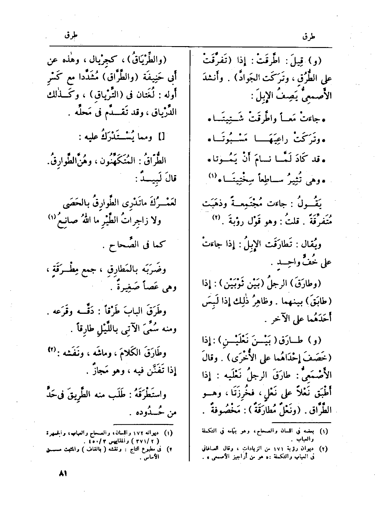 على الآخر. وطارَق بيْنَ نعْلَيْن: إِذا خَصَفَ إحْداهُما على الأخْرَى. وَقَالَ الأصْمَعيّ: طارَقَ الرجلُ نعْلَيْه: إِذا أطْبَق نعْلاً على نعْلٍ، فخُرِزَتا، وَهُوَ الطِّرّاق. ونعْلٌ مُطارَقَةٌ: مخْصوفةٌ.
