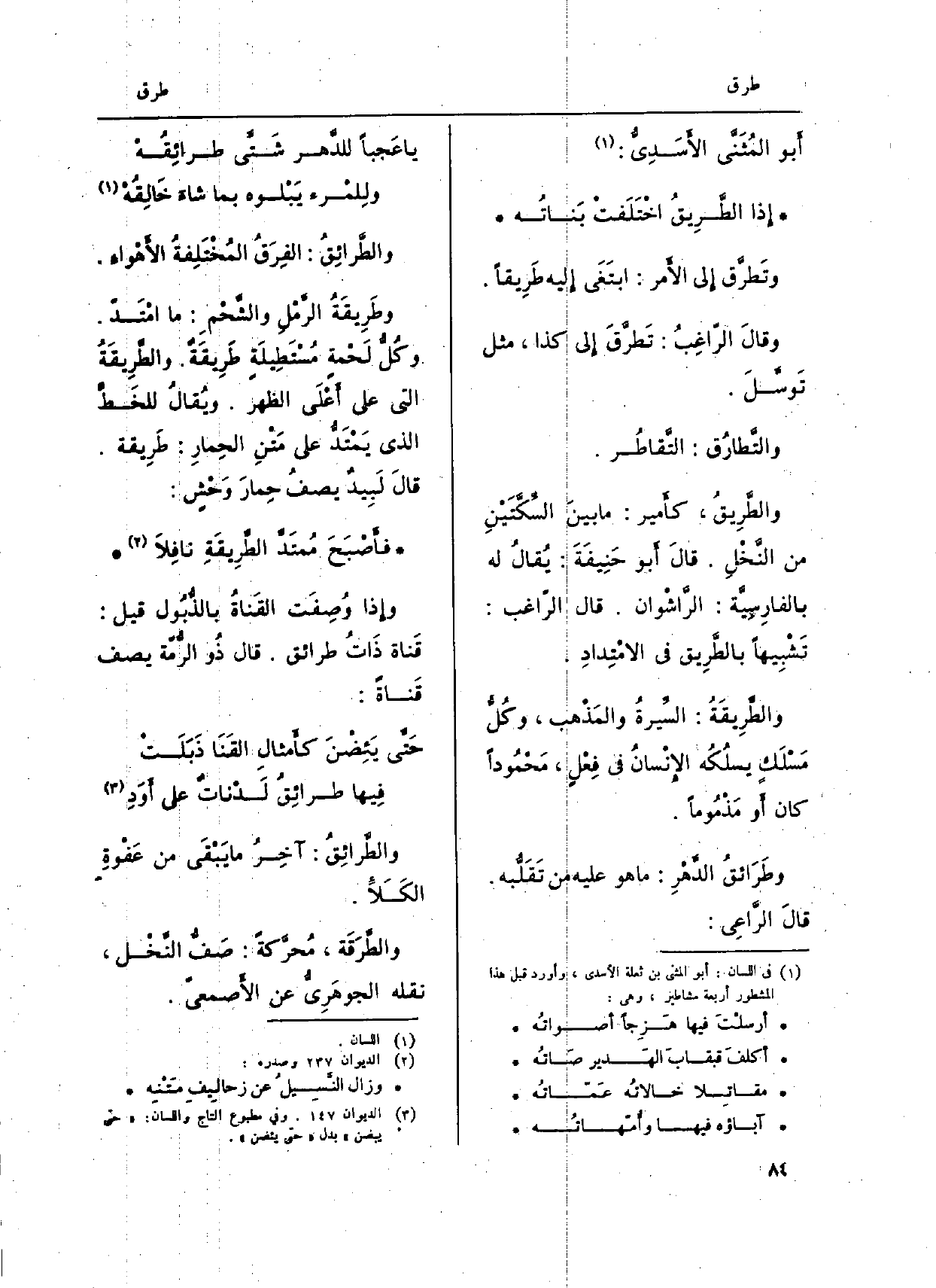 أَبُو المُثنّى الأسَديُّ: إِذا الطّريقُ اخْتلَفَتْ بناتُه وتطرّق الى الأمْر: ابتَغى إِلَيْهِ طَريقاً. وَقَالَ الرّاغِبُ: تطرّقَ الى كَذَا، مثل توسّل. والتّطارُق: التّقاطُر. والطّريقُ، كأمير: مَا بينَ السِّكَّتيْن من النّخْلِ. قَالَ أَبُو حَنيفَةَ: يُقال لَهُ بالفارسيّة: الرّاشْوان. قَالَ الرّاغب: تشْبيهاً بالطّريق فِي الامْتِداد. والطّريقَةُ: السّيرةُ والمَذْهَب، وكُلّ مسْلَكٍ يسلُكه الإنسانُ فِي فِعْل، محْموداً كَانَ أَو مذْموماً. وطَرائقُ الدّهْر: مَا هُوَ عَلَيْهِ من تقلُّبه. قَالَ الرّاعي: