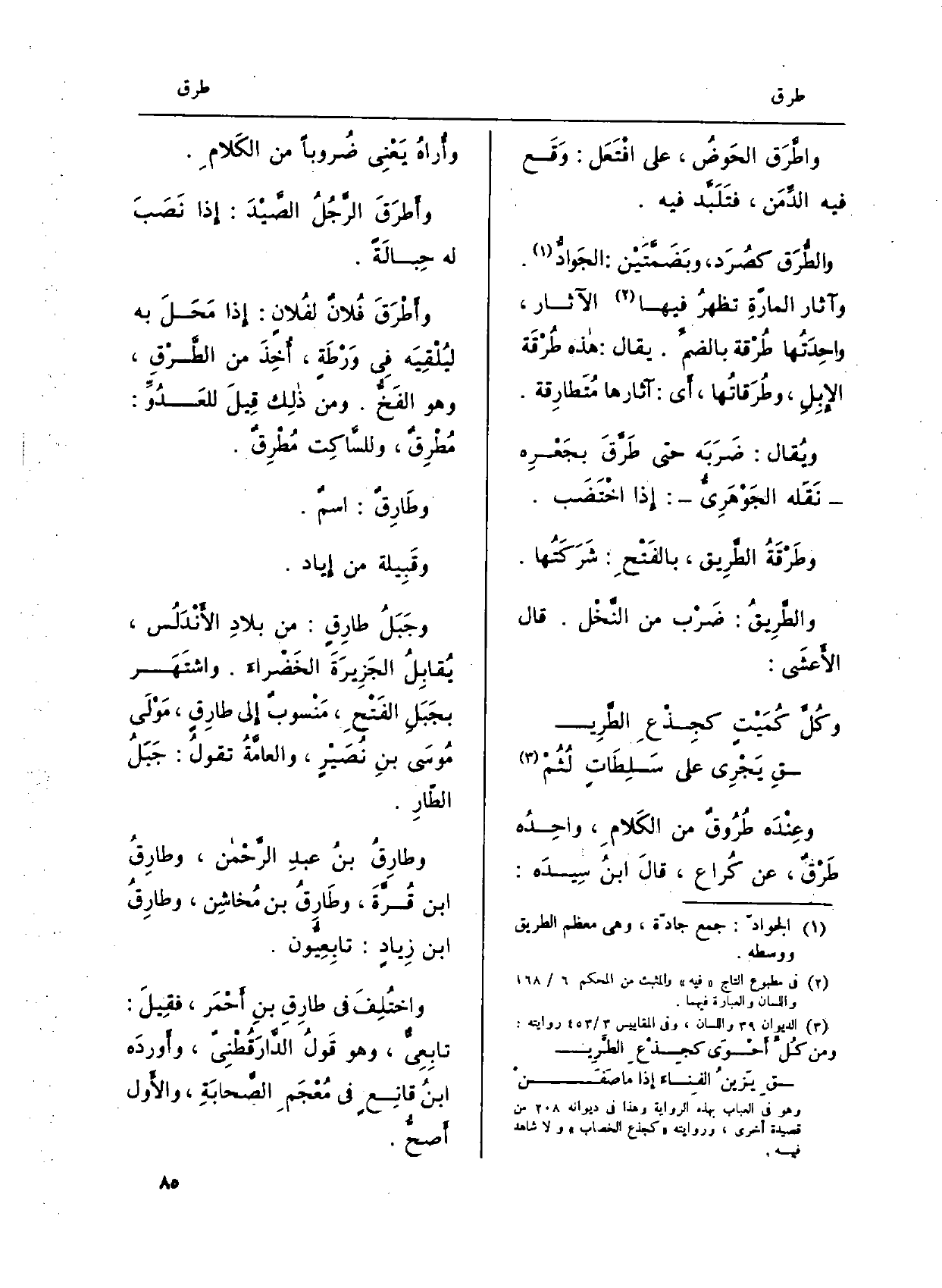 وعندَه طُروق من الكَلام، واحِدُه طَرْقٌ، عَن كُراع، قَالَ ابنُ سِيدَه: وأراهُ يعْني ضُروباً من الكَلام. وأطرَقَ الرّجُلُ الصَّيْدَ: إِذا نصَبَ لَهُ حِبالَةً. وأطْرَقَ فُلانٌ لفُلان: إِذا مَحَل بِهِ ليُلْقِيَه فِي وَرْطَة، أُخِذَ من الطَّرْق، وَهُوَ الفَخُّ. وَمن ذلِك قيلَ للعَدُوِّ: مُطْرِقٌ، وللسّاكِت مُطْرِقٌ. وطارِقٌ: اسْم. وقَبيلة من إياد. وجبَلُ طارِق: من بِلاد الأندَلُس، يُقابِلُ الجَزيرةَ الخضْراءَ. واشتَهَر بجَبَلِ الفتْح، منْسوبٌ الى طارِق، مَوْلَى مُوسَى بن نُصَيْر، والعامّة تَقول: جبلُ الطّارِ. وطارِقُ بنُ عبدِ الرّحْمن، وطارِقُ بن قُرّة، وطارِقُ بنُ مُخاشِن، وطارِقُ بن زِياد: تابِعيّون. واختُلِفَ فِي طارِقِ بن أحْمَر، فقيلَ: تابِعيٌّ، وَهُوَ قَول الدّارَقُطْنيّ، وأوردَه ابنُ قانِعٍ فِي مُعْجَم الصّحابَةِ، وَالْأول أصحّ.