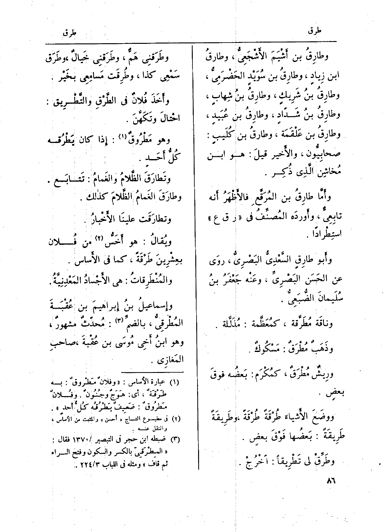 وطارِقُ بن أشْيَم الأشْجَعيُّ، وطارقُ بن زِيَاد، وطارِقُ بن سُوَيْد الحَضْرَميّ، وطارقُ بنُ شَريك، وطارقُ بنُ شِهاب، وطارقُ بنُ شدّادٍ، وطارقُ بن عُبَيد، وطارقُ بن علْقَمَة، وطارقُ بن كُلَيْب: صحابيّون، والأخير قيل: هُوَ ابْن مُخاشِن الَّذِي ذُكِر. وَأما طارِقُ بن المُرَقَّعِ فالأظْهَرُ أنّه تابعيٌّ، وأوردَه المُصنِّفُ فِي ر ق ع استِطْراداً. وَأَبُو طارِق السّعْديُّ البَصْريّ، روَى عَن الحسَن البَصْريّ، وَعنهُ جعْفَرُ بنُ سُلَيْمانَ الضُّبَعيُّ. وناقَة مُطَرَّقة، كمُعظَّمة: مُذَلَّلة. وذهبٌ مُطْرَقٌ: مسْكوك. وريشٌ مُطْرَقٌ، كمُكْرَم: بعضُه فوقَ بعضٍ. ووضَع الأشياءَ طُرْقَةً طُرْقَةً، وطَريقَةً طَريقةً: بعضُه فوقَ بعض. وطرِّقْ لي تَطْريقاً: اخْرُجْ. وطرَقَني همٌّ، وطرقَني خَيالٌ، وطَرَق سمْعي كَذَا، وطُرِقَت مَسامِعي بخَيْر. وأخذَ فُلانٌ فِي الطّرْقِ والتّطْريق: احْتالَ وتكهّن.