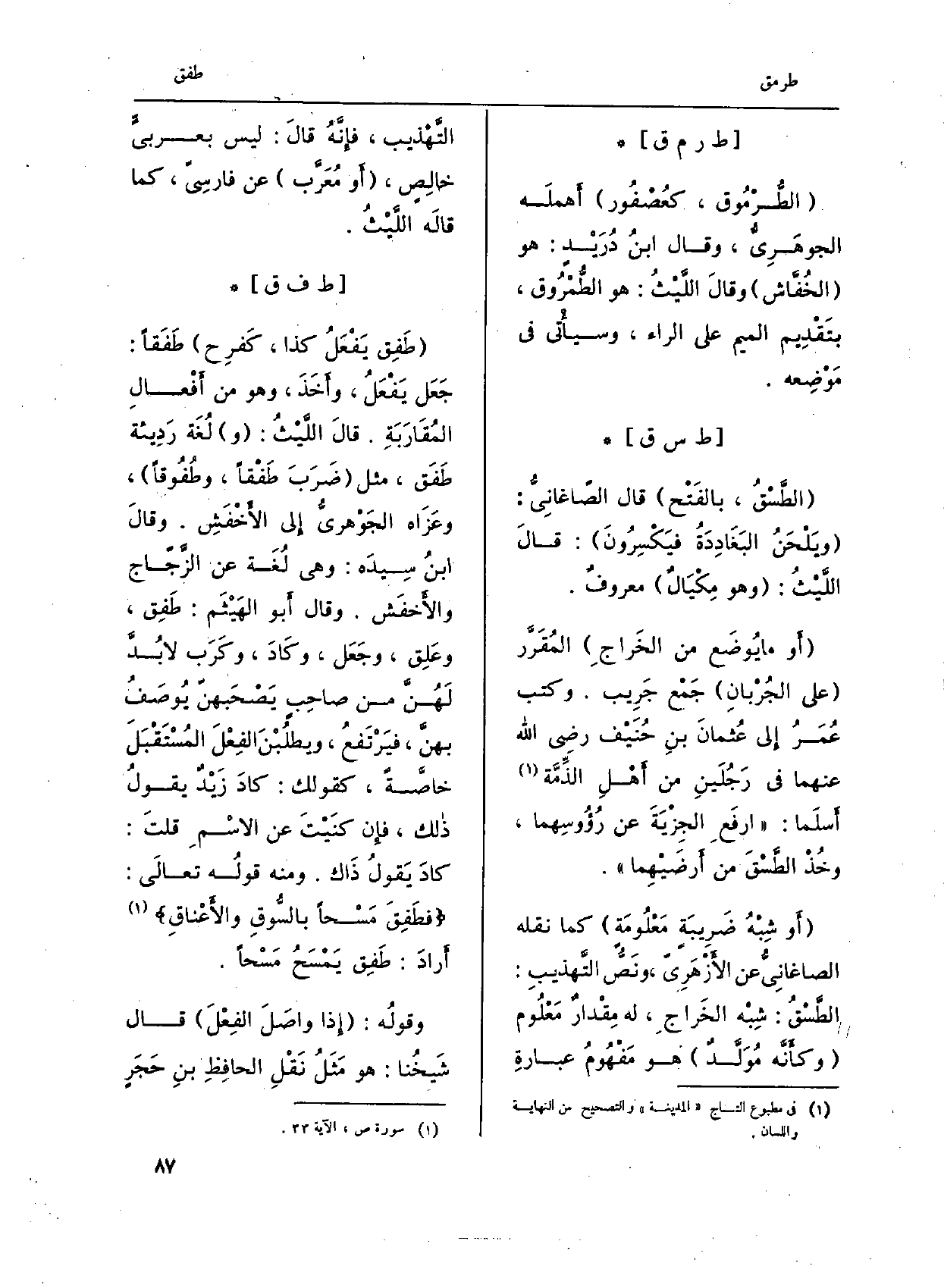 طَفِق يفْعَلُ كَذا، كفرِح طَفَقاً: جعَلَ يفعَلُ، وأخذَ، وَهُوَ من أفْعالِ المُقارَبَة. قَالَ الليْثُ: ولُغَة رَديئة طَفَق، مثل ضَرَبَ طَفْقاً، وطُفوقاً، وعَزاه الجَوْهَريّ الى الأخْفَش. وَقَالَ ابنُ سيدَه: وَهِي لُغة عَن الزّجّاج والأخفَش. وَقَالَ أَبُو الهَيثَم: طَفِق، وعلِقَ، وجَعَل، وكادَ، وكَرَب لابُدّ لهُنّ من صاحِب يصْحَبهنّ يوصَف بهنّ، فيرتَفِع، ويطلُبْن الفِعْلَ المُسْتَقْبَل خاصّةً، كَقَوْلِك: كادَ زيْدٌ يَقُول ذَلِك، فَإِن كنَيْتَ عَن الاسمِ قلت: كادَ يَقُول ذَاك. وَمِنْه قولُه تعالَى:) فطَفِقَ مَسْحاً بالسّوقِ والأعْناقِ (أَرَادَ: طَفِق يمْسَحُ مسْحاً. وقولُه: إِذا واصَلَ الفِعْلَ قَالَ شيخُنا: هُوَ مثَلُ نقْلِ الحافِظِ بنِ حَجَرٍ