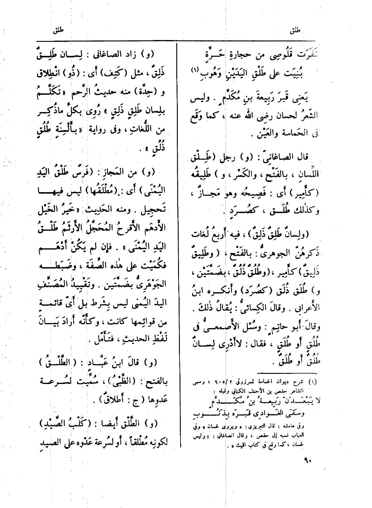 وَزَاد الصاغانيّ: لِسان طَلِقٌ ذَلِقٌ، مثل كتِف أَي: ذُو انْطِلاق وحِدّة مِنْهُ حديثُ الرّحم تكلّمُ بلِسان طَلِق ذَلِق رُوِي بكلّ مَا ذُكِر من اللّغات، وَفِي رِوَايَة بألْسِنَةٍ طُلُقٍ ذُلُقٍ. وَمن المَجاز: فَرسٌ طَلْقُ اليَدِ اليُمْنى أَي: مُطْلَقُها لَيْسَ فِيهَا تَحجيل. وَمن الحَديث خيرُ الخيْل الأدهَم الأقرحُ المُحجَّلُ الأرثَمُ طلْقُ اليَدِ اليُمْنى. فَإِن لم يكُن أدهَم فكُمَيْت على هَذِه الصِّفة، وضبَطَه الجوهريّ بضمّتَين. وتقْييدُ المُصنِّفِ اليَدَ اليُمنى ليسَ بشَرط بل أيّ قائمةٍ من قوائِمها كَانَت، وكأنّه أرادَ بَيانَ لفْظِ الحديثِ، فتأمّل. وَقَالَ ابنُ عبّادٍ: الطّلْقُ بِالْفَتْح: الظَّبْيُ، سُميت لسُرعة عدوِها ج: أطلاقٌ. والطّلْق أَيْضا: كلْبُ الصّيْد لكونِ مُطْلقاً، أَو لسُرعة عَدْوه على الصّيد.