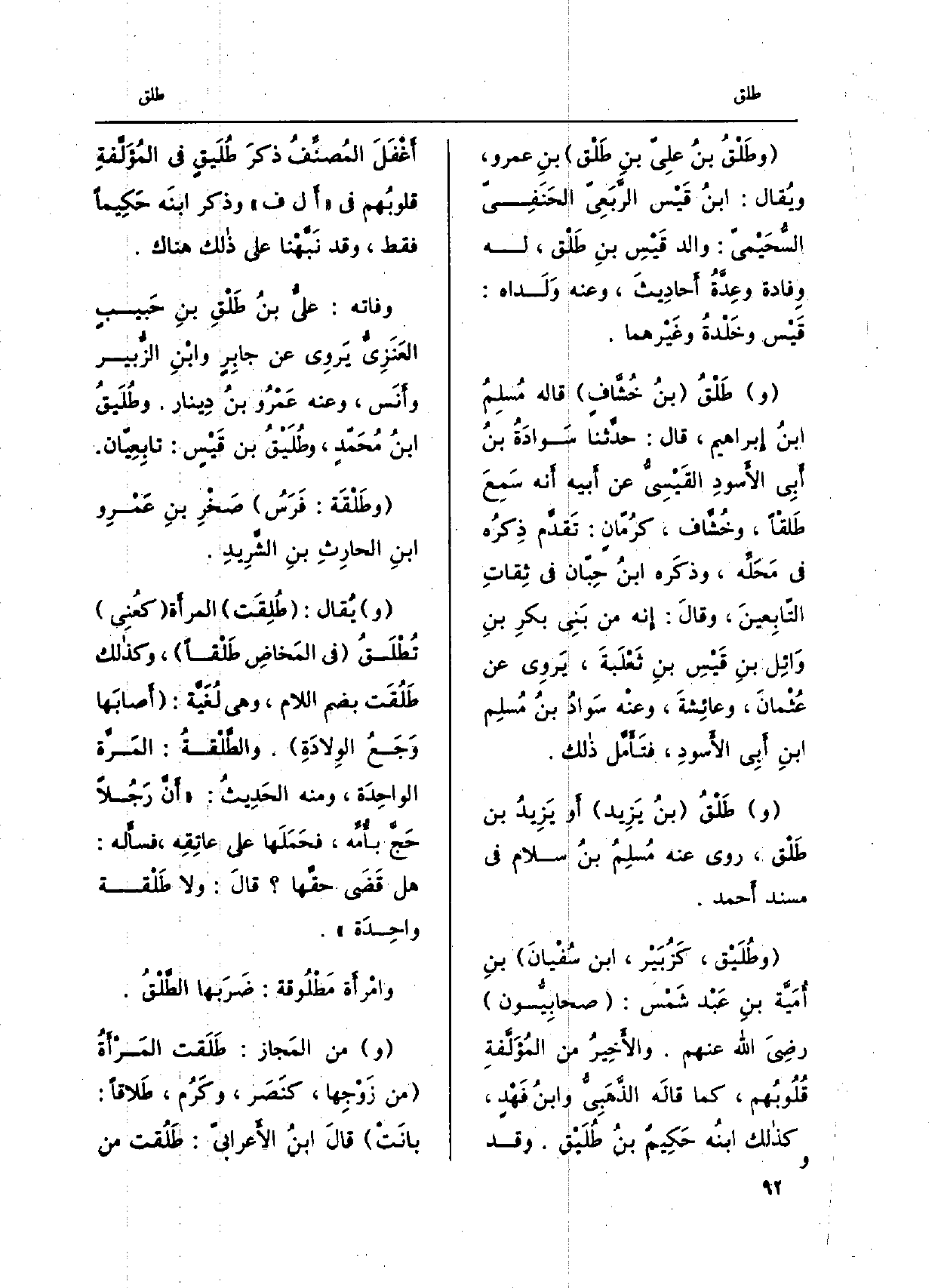 وطَلْقُ بنُ عليّ بنِ طَلْق بنِ عَمْرو، ويُقال: ابنُ قَيْس الرّبَعِيّ الحَنَفِيّ السُحَيْميّ: وَالِد قَيْسِ بنِ طَلْق، لَهُ وِفادة وعِدّةُ أحاديثَ، وَعنهُ وَلَداه: قَيْس وخَلْدةُ وَغَيرهمَا. وطَلقُ بنُ خُشّافٍ قَالَه مُسلِمُ بنُ إِبْرَاهِيم، قَالَ: حدّثنا سَوادَةُ بنُ أبي الأسودِ القَيْسيُّ عَن أَبِيه أَنه سمِعَ طَلْقاً، وخُشّاف، كرُمّان: تقدّم ذكرُه فِي محلّه، وذكَره ابنُ حِبّان فِي ثِقاتِ التّابعين، وَقَالَ: إِنَّه من بَني بكرِ بن وائِل بنِ قَيْس بنِ ثَعْلَبَة، يَروي عَن عُثْمان، وعائشةَ، وَعنهُ سَوادُ بنُ مُسلِم بنِ أبي الأسودِ، فتأمّل ذَلِك. وطَلْقُ بنُ يَزيد أَو يَزيدُ بن طَلْق، روى عَنهُ مُسلِمُ بنُ سَلام فِي مُسْند أَحْمد. وطُلَيْق، كزُبَيْر، ابْن سُفْيان بنِ أميّة بنِ عبْدِ شمْس: صحابيّون رضيَ الله عَنْهُم. والأخيرُ من المؤلَّفة قُلوبُهم، كَمَا قالَه الذّهَبيّ وابنُ فهْدٍ، وَكَذَلِكَ ابنُه حَكيمُ بنُ طُلَيْق. وَقد أغْفَلَ المصنِّف ذكرَ طُلَيق فِي المؤلَّفة قُلوبهم فِي أل ف وَذكر ابنَه حَكيماً فَقَط، وَقد نبّهْنا على ذَلِك هُنَاكَ. وَفَاته: عليُّ بنُ طلْقِ بنِ حَبيبٍ العَنَزيُّ يَروي عَن جابِرٍ وابْنِ الزُّبَيْر وأنَس، وَعنهُ عَمْروُ بنُ دِينَار. وطُلَيقُ بنُ محمّدٍ، وطُلَيْقُ)