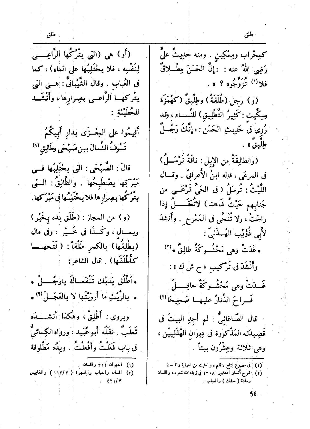 قَالَ: الصّبْحَى: الَّتِي يحْتَلِبُها فِي مبْرَكِها يصطَبِحُها. والطّالِق: الَّتِي يترُكُها بصِرارِها فَلَا يحتلِبُها فِي مبْرَكها. وَمن الْمجَاز: طَلَق يَده بخَيْر وبمالٍ، وكَذا فِي خيْر، وَفِي مَال يطْلِقُها بالكسْرِ طَلْقاً: فتَحَها كأطْلَقَها. قَالَ الشَّاعِر: أطْلُق يَديْك تنْفَعاكَ يَا رجُلْ بالرّيْثِ مَا أروَيْتَها لَا بالعَجَلْ ويروى: أطلِقْ، وَهَكَذَا أنشدَه ثعلَبٌ. نقلَه أَبُو عُبيد، وَرَوَاهُ الكِسائي فِي بَاب فعَلْتُ وأفعلْتُ. ويدُه مطلوقة