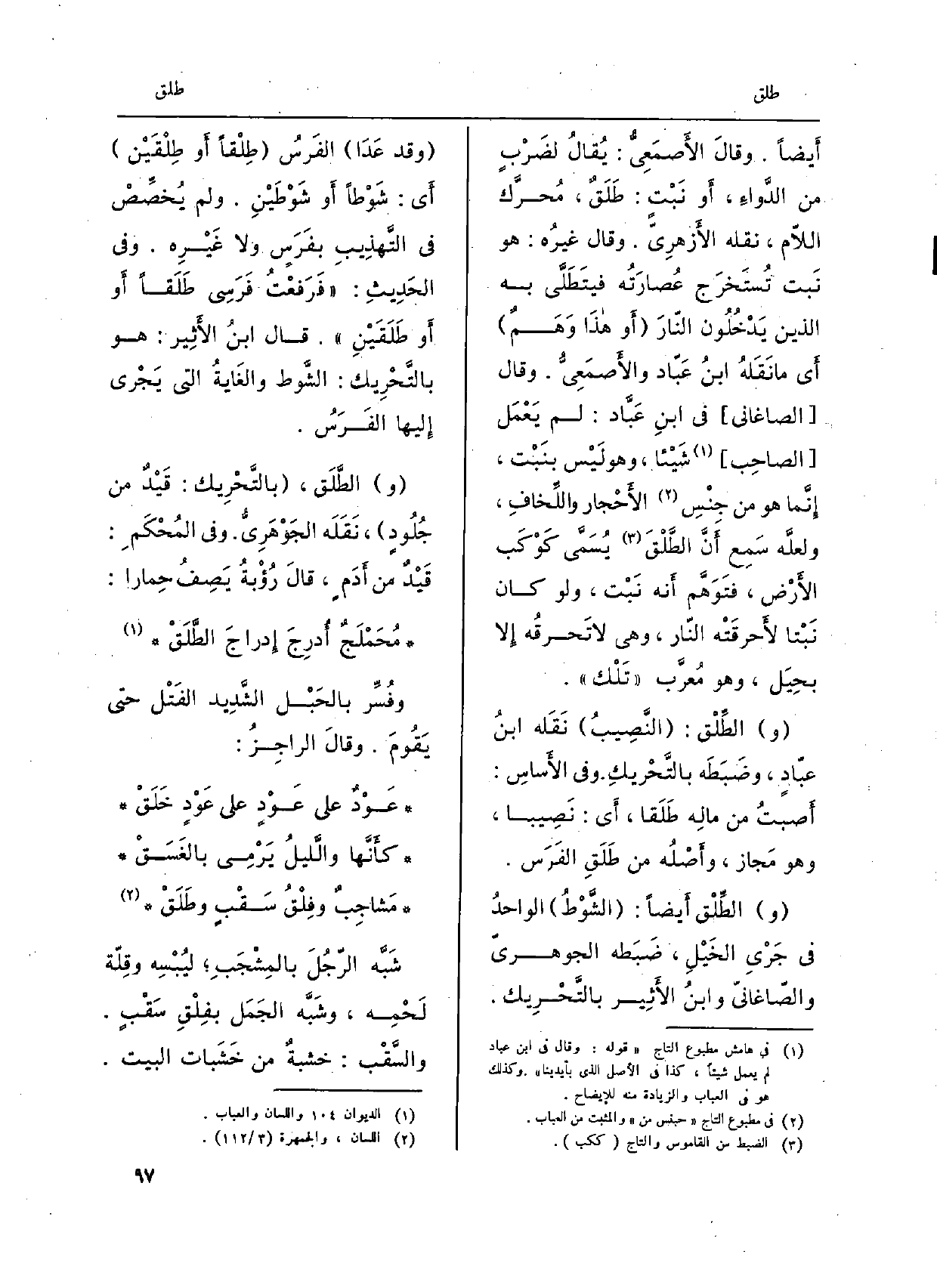 أَيْضا. وَقَالَ الْأَصْمَعِي: يُقالُ لضَرْبٍ من الدّواءِ، أَو نبْتٍ: طَلَقٌ، مُحرَّك اللاّم، نَقله الأزهريّ. وَقَالَ غيرُه: هُوَ نبت تُستَخرَج عُصارَتُه فيتطَلّى بِهِ الَّذين يدخُلون النّار أَو هَذَا وَهَمٌ أَي مَا نقلَه ابنُ عبّاد والأصمعي. وَقَالَ الصَّاغَانِي فِي ابنِ عبّاد: لم يعْمَل الصاحِب شيْئاً، وَهُوَ ليسَ بنَبْت، إنّما هُوَ من جِنسِ الأحْجارِ واللِّخافِ، ولعلّه سمِع أنّ الطّلْقَ يُسمّى كوْكَب الأَرْض، فتوهّم أَنه نبْت، وَلَو كَانَ نبْتاً لأحْرقَتْه النّار، وَهِي لَا تَحرقُه إِلَّا بحِيَل، وَهُوَ مُعرَّب تَلْك. والطِّلْق: النّصيبُ نقَله ابنُ عبّادٍ، وضَبَطَه بالتّحْريكِ. وَفِي الأساس: أصبتُ من مالِه طَلَقاً، أَي: نَصيباً، وَهُوَ مَجاز، وأصْلُه من طَلَقِ الفرَس. والطِّلْق أَيْضا: الشّوطُ الواحدُ فِي جرْيِ الخيْل، ضبَطَه الجوهريّ والصّاغاني وابنُ الْأَثِير بالتّحْريك. وَقد عَدا الفرسُ طِلْقاً أَو طِلْقَيْن أَي: شوْطاً أَو شوْطَيْن. وَلم يُخصِّصْ فِي التّهذيبِ بفَرَسٍ وَلَا غيرِه. وَفِي)