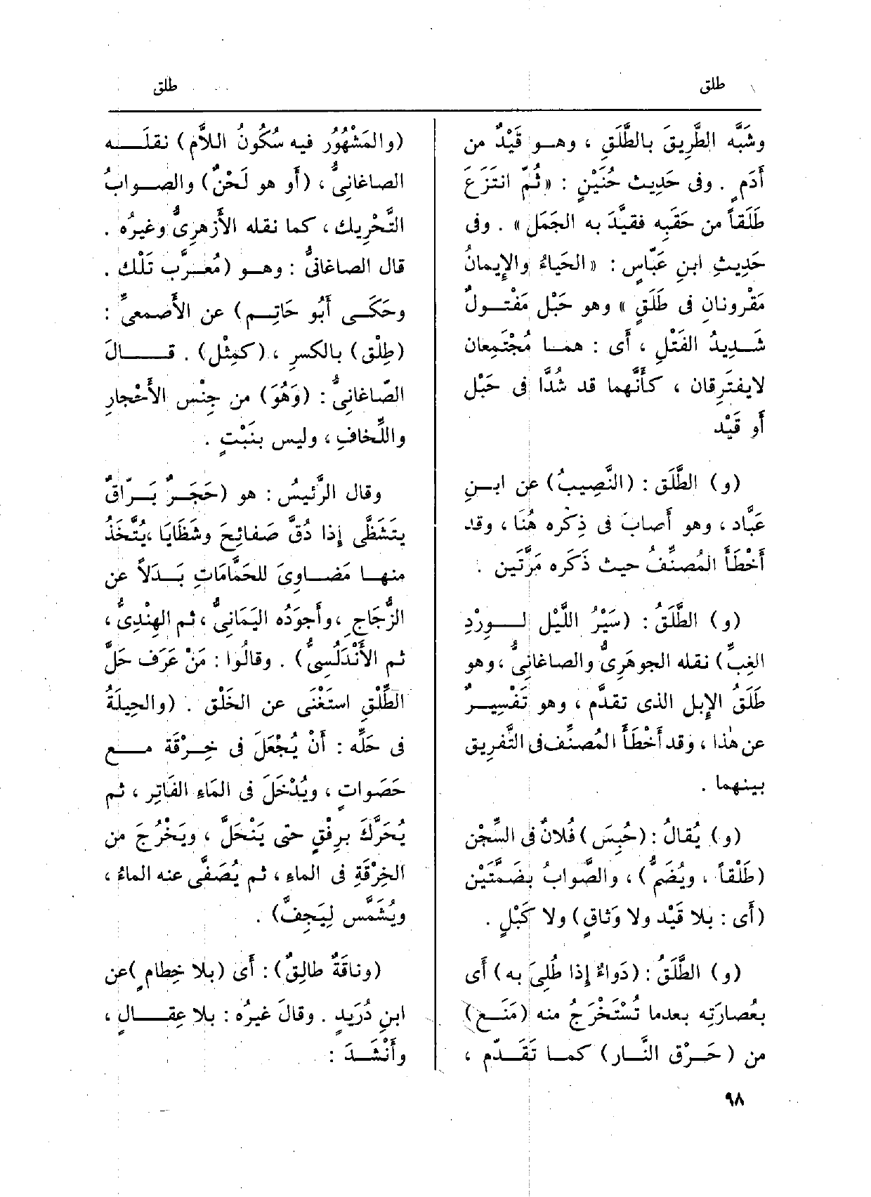 وشبّه الطّريقَ بالطَّلَق، وَهُوَ قيْدٌ من أدَم. وَفِي حَديث حُنَيْن: ثمّ انتزَعَ طَلَقاً من حقَبِه فقيّدَ بِهِ الجمَل. وَفِي حَديث ابنِ عبّاس: الحَياءُ والإيمانُ مَقْرونانِ فِي طَلَقٍ وَهُوَ حبْل مفْتولٌ شَديدُ الفَتْلِ، أَي: هما مُجتَمِعان لَا يفترِقان، كأنّهما قد شُدّا فِي حبْل أَو قَيْد. والطّلَق: النّصيبُ عَن ابنِ عبّاد، وَهُوَ أصابَ فِي ذِكْره هُنا، وَقد أخْطأ المُصنِّفُ حَيْثُ ذكَره مرّتين. والطّلَقُ: سيْرُ اللّيْلِ لوِرْدِ الغِبِّ نَقله الجوهَريُّ والصّاغانيّ، وَهُوَ طَلَقُ الْإِبِل الَّذِي تقدّم، وَهُوَ تَفْسيرٌ عَن هَذَا، وَقد أَخطَأ المُصنِّف فِي التّفريق بَينهمَا. ويُقال: حُبِسَ فُلانٌ فِي السِّجْن طَلْقاً، ويُضَمُّ، والصّوابُ بضمّتَيْن أَي: بِلَا قَيْد وَلَا وَثاقٍ وَلَا كَبْلٍ. والطّلَقُ: دَواءٌ إِذا طُلِيَ بِهِ أَي بعُصارَتِه بَعْدَمَا تُسْتَخْرَجُ مِنْهُ منَع من حَرْق النّار كَمَا تقدّم، والمَشْهور فِيهِ سُكونُ اللاّم نَقله الصّاغاني، أَو هُوَ لَحْنٌ وَالصَّوَاب التّحْريك، كَمَا نَقله الأزهريُّ وغيرُه. قَالَ الصَّاغَانِي: وَهُوَ مُعرَّب تَلْك. وحكَى أَبُو حاتِم عَن الْأَصْمَعِي: طِلْق بِالْكَسْرِ، كمِثْل. قَالَ الصاغانيّ: وهُو من جِنْس الأحْجارِ واللِّخافِ، وَلَيْسَ بنَبتٍ. وَقَالَ الرّئيس: هُوَ حَجَرٌ بَرّاقٌ يتشظّى إِذا دُقَّ صَفائِحَ وشَظايا، يُتّخَذُ مِنْهَا مَضاويَ للحَمّاماتِ بدَلاً عَن الزُّجاج، وأجوَدُه اليَمانيُّ، ثمَّ الهِنْديُّ، ثمَّ الأندلُسيّ. وَقَالُوا: مَنْ عَرَف حلَّ الطِّلْقِ استَغْنى عَن الخَلْق. والحِيلَةُ فِي حَلِّه: أَن يُجْعَلَ فِي خِرْقَة مَعَ حصَواتٍ، ويُدْخَلَ فِي الماءِ الفاتِرِ، ثمَّ يحرَّكَ برِفْقٍ حَتَّى ينْحَلَّ، ويخْرُجَ من الخِرْقَة فِي الماءِ، ثمَّ يُصَفّى عَنهُ الماءُ، ويُشَمَّس ليَجِفّ. وناقَةٌ طالِقٌ: أَي بِلَا خِطامٍ عَن ابنِ دُرَيْد. وَقَالَ غيرُه: بِلَا عِقال، وأنْشَد:)