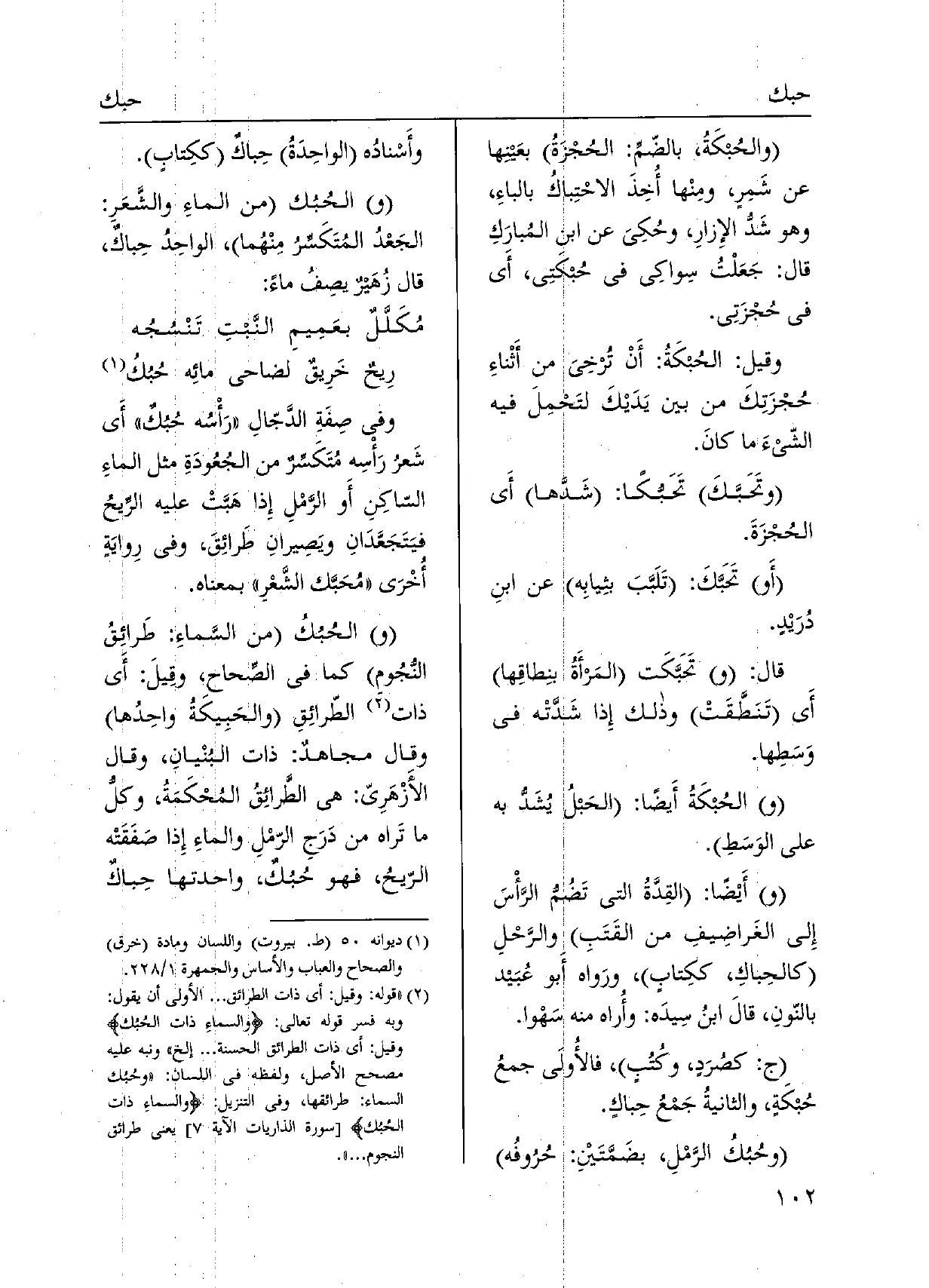 كصُرَدٍ، وكُتُبٍ، فالأُولَى جمعُ حُبكَةٍ، والثانيةُ جَمْعُ حِباكٍ. وحُبُكُ الرَّمْلِ، بضَمَّتَيْنِ: حُرُوفُه وأَسْنادُه الواحِدَةُ حِباكٌ ككِتابٍ. والحُبُك من الماءِ والشَّعَرِ: الجَعْدُ المُتَكَسِّرُ مِنْهُما، الواحِدُ حِباكٌ، قَالَ زُهَيرٌ يصِفُ مَاء: