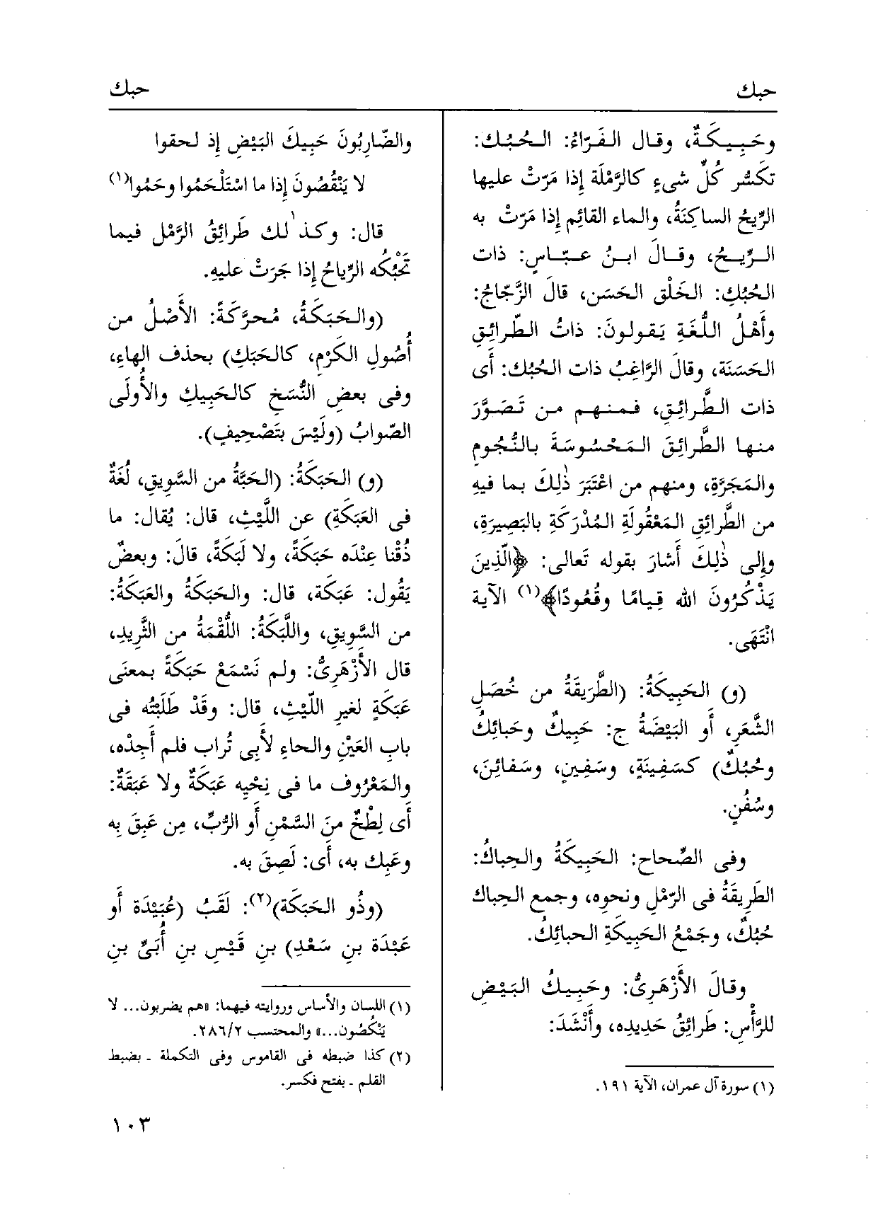 قَالَ: وَكَذَلِكَ طَرائِقُ الرَّمْل فِيمَا تَحْبُكُه الرِّياح إِذا جَرَتْ عليهِ. والحَبَكَةُ، مُحرَّكَةً: الأَصْلُ من أُصُولِ الكَرمِ، كالحَبَكِ بِحَذْف الهاءِ، وَفِي بعضِ النُّسَخِ كالحَبِيكِ والأُولَى الصّوابُ وليسَ بتَصْحِيفٍ. والحَبَكَةُ: الحَبَّةُ من السَّوِيقِ، لُغَةٌ فِي العَبَكَةِ عَن اللَّيثِ، قَالَ: يُقال: مَا ذُقْنا عِنْدَه حَبَكَةً، وَلَا لَبَكَةً، قالَ: وبعضٌ يَقُول: عَبَكَة، قَالَ: والحَبَكَةُ والعَبَكَةُ: من السَّوِيقِ، واللَّبَكَةُ: اللّقْمَةُ من الثَّرِيدِ، قَالَ الأَزْهَرِيُّ: وَلم نَسمَعْ حَبَكَةً بمعنَى عَبَكَةٍ لغيرِ اللّيثِ، قَالَ: وقَدْ طَلبتُه فِي بابِ العَين والحاءِ لأبي تُراب فَلم أَجِدْه، والمَعْرُوف مَا فِي نِحْيِه عَبَكَةٌ وَلَا عَبَقَةٌ: أَي لِطْخٌ منَ السَّمْنِ أَو الرّبِّ، مِن عَبِقَ بِه وعَبِك بِهِ، أَي: لَصِقَ بِهِ. وذُو الحَبَكَة: لَقَبُ عُبَيدَة أَو عَبدَة بنِ سَعْدِ بنِ قَيس بنِ أبي بنِ