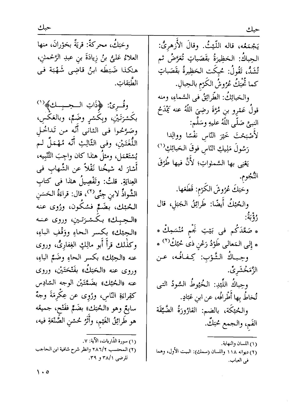 والحُبكُ أَيْضا: طَرائقُ الجَبَلِ، قَالَ رُؤْبَةُ: صَعَّدَكُم فِي بَيتِ نَجْمٍ مُنْسَمكْ إِلى المَعالي طَوْدُ رَعْنٍ ذِي حبُكْ وحِباكُ الثَّوْبِ: كِفافه، عَن الزَّمَخْشَرِيِّ. وحِباكُ اللِّبدِ: الخُيُوطُ السّودُ الَّتِي تُخاطُ بِها أَطْرافُه، عَن ابنِ عَبّادٍ. والحُبكَة، بِالضَّمِّ: القارُورَةُ الضَّيِّقَة الفَمِ، وَالْجمع حُبَك. وحَبَك، محركة: قريَةٌ بحَوْرانَ، مِنْهَا الحلاءُ عَلي بنُ زِيادَةَ بنِ عبدِ الرَحْمن، هَكَذَا ضَبَطَه ابنُ قاضِي شَهْبَة فِي الطَّبَقاتِ. وقُرِئ: ذَاتِ الحِبِك بكَسرَتَين، وبكسرٍ وضَم، وبالعَكسِ، وصَرَّحُوا فِي الثَّانِي أَنّه من تَداخُلِ اللُّغَتَين، وَفِي الثّالِثِ أَنّه مُهْمَلٌ لم يُستَعْمَل، ومثلُ هَذَا كَانَ واجِبَ التَّنْبِيه، أَشارَ لَهُ شيخُنا نَقْلاً عَن الشِّهابِ فِي العِنايَةِ. قلتُ: وتَفْصِيلُ هَذَا فِي كتابِ الشَّواذِّ لابنِ جِنِّى، قَالَ: قِرَاءَة الحَسَنِ الحُبك، بضَم فسُكُون، ورُوى عَنهُ الحِبِك بكسرتينِ، وروى عَنهُ الحِبك بِكَسْر الحاءِ ووَقفِ الباءِ، وَكَذَلِكَ قرأَ أَبو مالكٍ الغِفارِيّ، وروى عَنهُ الحِبُك بِكَسْر الحاءِ وضَمِّ الباءِ، وروى عَنهُ الحَبَكُ بفَتْحَتَيْن، وروى عَنهُ الحُبُك بضَمَّتَينْ الْوَجْه)