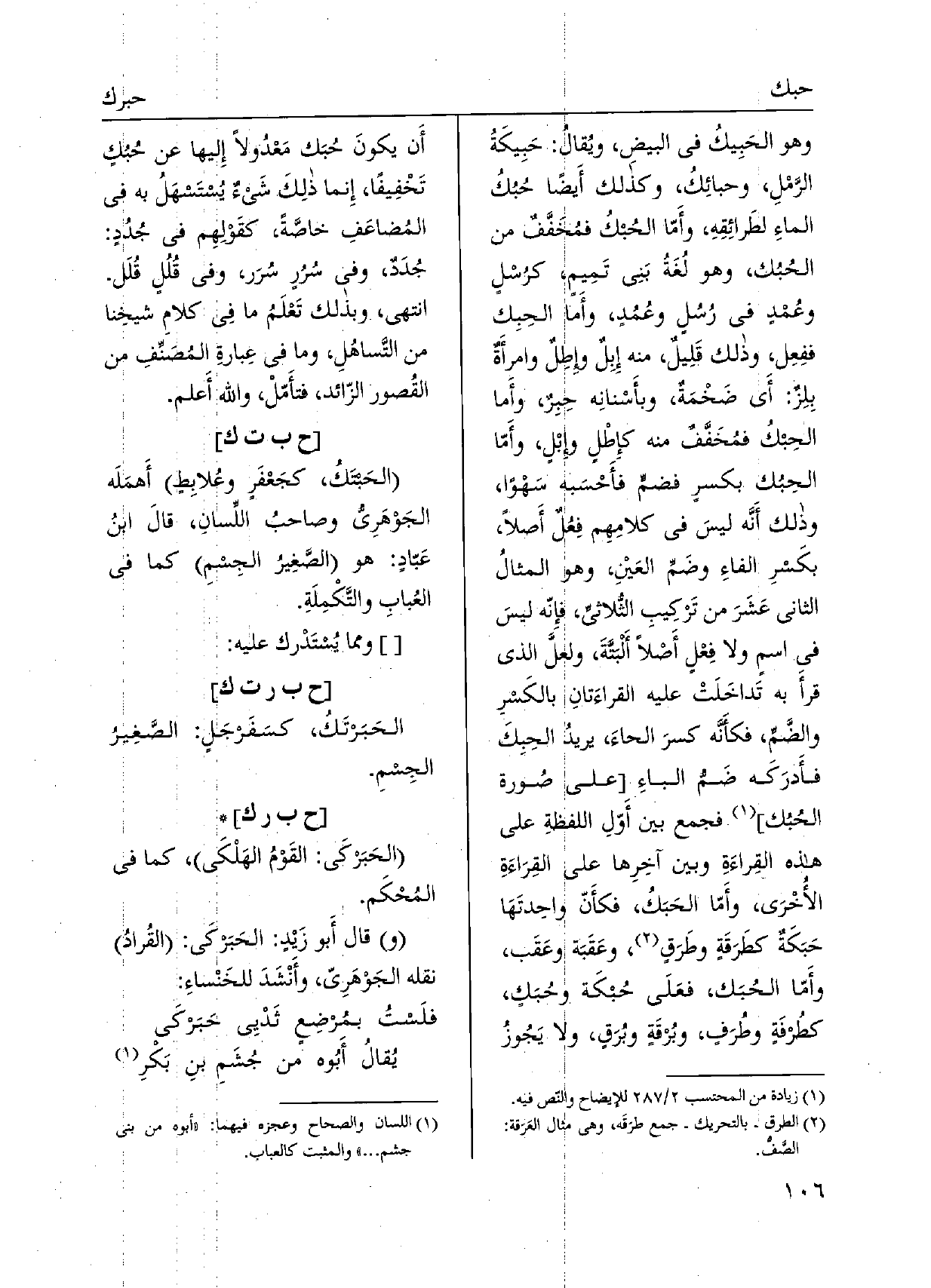 وَهُوَ الحَبِيكُ فِي الْبيض، ويُقالُ: حَبِيكَةُ الرَّمْلِ، وحبائِكُ، وَكَذَلِكَ أَيْضا حُبُكُ الماءِ لطَرائِقِهِ، وأَمّا الحُبكُ فمُخَفَّفٌ من الحُبُك، وَهُوَ لُغَةُ بني تَمِيمٍ، كرُسْلٍ وعُمْدٍ فِي رُسُلٍ وعُمُدٍ، وأَما الحِبِك ففِعِل، وَذَلِكَ قَلِيلٌ، مِنْهُ إِبِلٌ وِإطِلٌ وامرأَةٌ بِلِزٌ: أَي ضَخْمَةٌ، وبأَسْنانِه حِبِرٌ، وأَما الحِبكُ فمُخَفَّفٌ مِنْهُ كإِطْلٍ وِإبْل، وأَمّا الحِبُك بكسرٍ فضم فأَحْسَبه سَهْواً، وَذَلِكَ أَنَّه ليسَ فِي كلامِهِم فِعُلٌ أَصلاً، بِكَسْر الفاءِ وضَمِّ العَيْنِ، وَهُوَ المثالُ الثَّانِي عَشَرَ من تركِيبِ الثُّلاثيِّ، فإِنّه ليسَ فِي اسمٍ وَلَا فِعْلٍ أَصْلاً أَلْبتَّةَ، ولعلَّ الَّذِي قرأَ بِهِ تَداخَلَتْ عَلَيْهِ القراءَتانِ بِالْكَسْرِ والضَّمِّ، فكأَنَّه كسرَ الحاءَ، يريدُ الحِبِكَ فأَدرَكَه ضَمُّ الباءِ على صُورة الحُبُك فَجمع بَين أَوّلِ اللفظةِ على هَذِه القِراءةِ وَبَين آخِرِها على القِرَاءةِ الأخْرَى، وأَمّا الحَبَكُ، فكأَنّ واحِدتَهَا حَبَكَةٌ كطَرَقَةٍ وطَرَقٍ، وعَقَبَة وعَقَب، وأَمّا الحُبَك، فعَلَى حُبكَة وحُبَكٍ، كطُرفَةٍ وطُرَفٍ، وبُرقَةٍ وبُرَقٍ، وَلَا يَجُوزُ أَن يكونَ حُبَك مَعْدُولاً إِليها عَن حُبُكٍ تَخْفِيفاً، إِنما ذلِكَ شَيءٌ يُستَسهَلُ بِهِ فِي المُضاعَفِ خاصَّةً، كقَوْلِهِم فِي جُدُدٍ: جُدَدٌ، وَفِي سُرُرٍ سُرَر، وَفِي قلُل قُلَل. انْتهى، وَبِذَلِك تَعْلَمُ مَا فِي كلامِ شيخِنا من التَّساهُلِ، وَمَا فِي عِبارةِ المُصَنِّفِ من القُصور الزّائد، فتأَمّلْ، وَالله أَعلم.