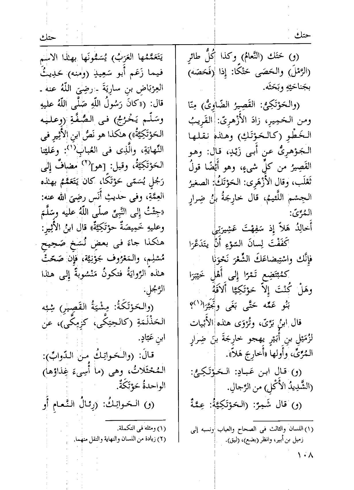 وحَتَك النَّعامُ وَكَذَا كُلُّ طائرٍ الرَّمْلَ والحَصَى حَتْكاً: إِذا فَحَصَه بجَناحَيهِ وبَحَثَه. والحَوْتَكِي: القَصِيرُ الضّاوِيُّ مِنّا وَمن الحَمِيرِ، زادَ الأَزْهرِيّ: القَرِيبُ الخَطْوِ كالحَوْتَك وَهَذِه نقلهَا الجَوْهرِيُّ عَن أبي زَيْد، قَالَ: وَهُوَ القَصِيرُ من كلٍّ شيءٍ، وَهُوَ أَيْضا قولُ ثَعْلَب، وَقَالَ الأزْهَرِي: الحَوْتَكُ: الصغيرُ الجِسم اللَّئيمُ، قَالَ خارِجَةُ بنُ ضِرارٍ المُرّيّ: