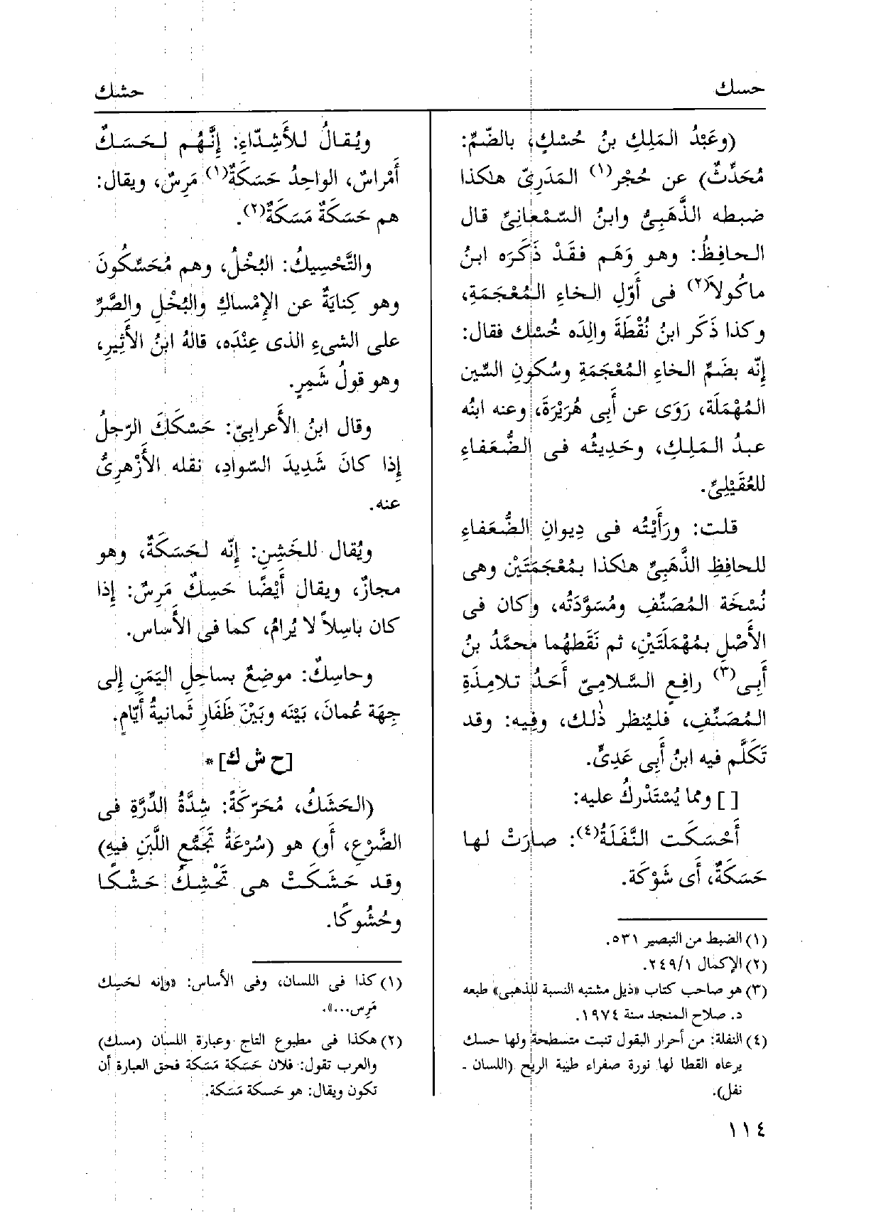 وَعبد المَلِكِ بنُ حسكٍ، بالضّمِّ: مُحَدِّثٌ عَن حُجْر المَدَرِيّ هَكَذَا ضَبطه الذَّهَبِيّ وابنُ السَّمْعَانِيّ قَالَ الحافِظُ: وَهُوَ وَهَم فقَدْ ذَكَرَه ابنُ ماكُولاَ فِي أَوّلِ الخاءِ المُعْجَمَةِ، وَكَذَا ذَكَر ابنُ نُقْطَةَ والِدَه خُسك فَقَالَ: إِنّه بضَمِّ الخاءِ المُعْجَمَةِ وسُكونِ السِّين المُهْمَلَة، رَوَى عَن أَبِي هُرَيْرَةَ، وَعنهُ ابنُه عبدُ المَلِكِ، وحَدِيثُه فِي الضّعَفاءِ للعُقَيلِي.