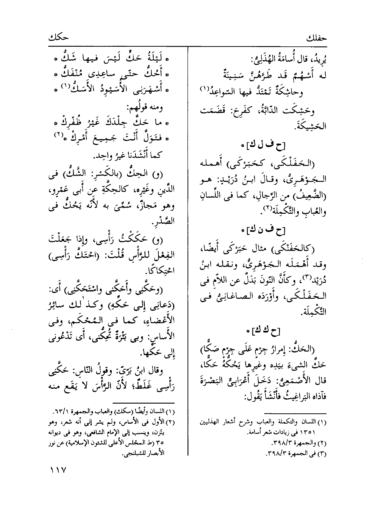 {الحَكّ: إِمرارُ جِرمٍ عَلَى جِرمٍ صَكًّا} حَكَّ الشَّيْء بيَدِه وغيرِها {يَحُكّهُ} حَكًّا، قَالَ الأَصْمَعِي: دَخَلَ أَعْرَابِيٌ البَصْرَةَ فآذاه البَراغِيثُ فأَنْشَأَ يَقُول: لَيلَةُ {حَكٍّ لَيسَ فِيهَا شَكُّ} أَحُكُّ حتّى ساعِدِي مُنْفَكّ أَسْهَرَنِي الأسيوِدُ الأَسَكُّ وَمِنْه قولُهم: مَا حَكَّ جِلْدَكَ غَيرُ ظُفْرِكْ فتَوَلَّ أَنْتَ جَمِيعَ أَمْرِكْ كَمَا أَنْشَدَنا غيرُ واحِد. (و) {الحِكُّ بالكسرِ: الشَّكّ فِي الدِّينِ وغَيرِه،} كالحِكَّةِ عَن أبي عَمرو، وَهُوَ مَجازٌ، سُمِّيَ بِهِ لأَنّه {يَحُكُّ فِي الصَّدْرِ. (و) } حَكَكْتُ رَأْسِي، وِإذا جَعَلْتَ الفِعْلَ للرَّأْسِ قُلْتَ: {احْتَكَّ رَأْسِي} احتِكاكاً. {وحَكَّني} وأَحَكَّني {واسْتَحَكَّني أَي: دَعانِي إِلى} حَكِّهِ وَكَذَلِكَ سائِرُ الأَعْضاءِ، كَمَا فِي المُحْكَم، وَفِي الأَساسِ: وَبِي بثرَةٌ {تُحِكُّني، أَي تَدْعُوني إِلى} حَكِّها. وَقَالَ ابنُ بَرّيّ: وَقَول النّاسِ:! حَكَّني رَأْسِي غَلَط، لأَنّ الرَّأسَ لَا يَقَع مِنْهُ